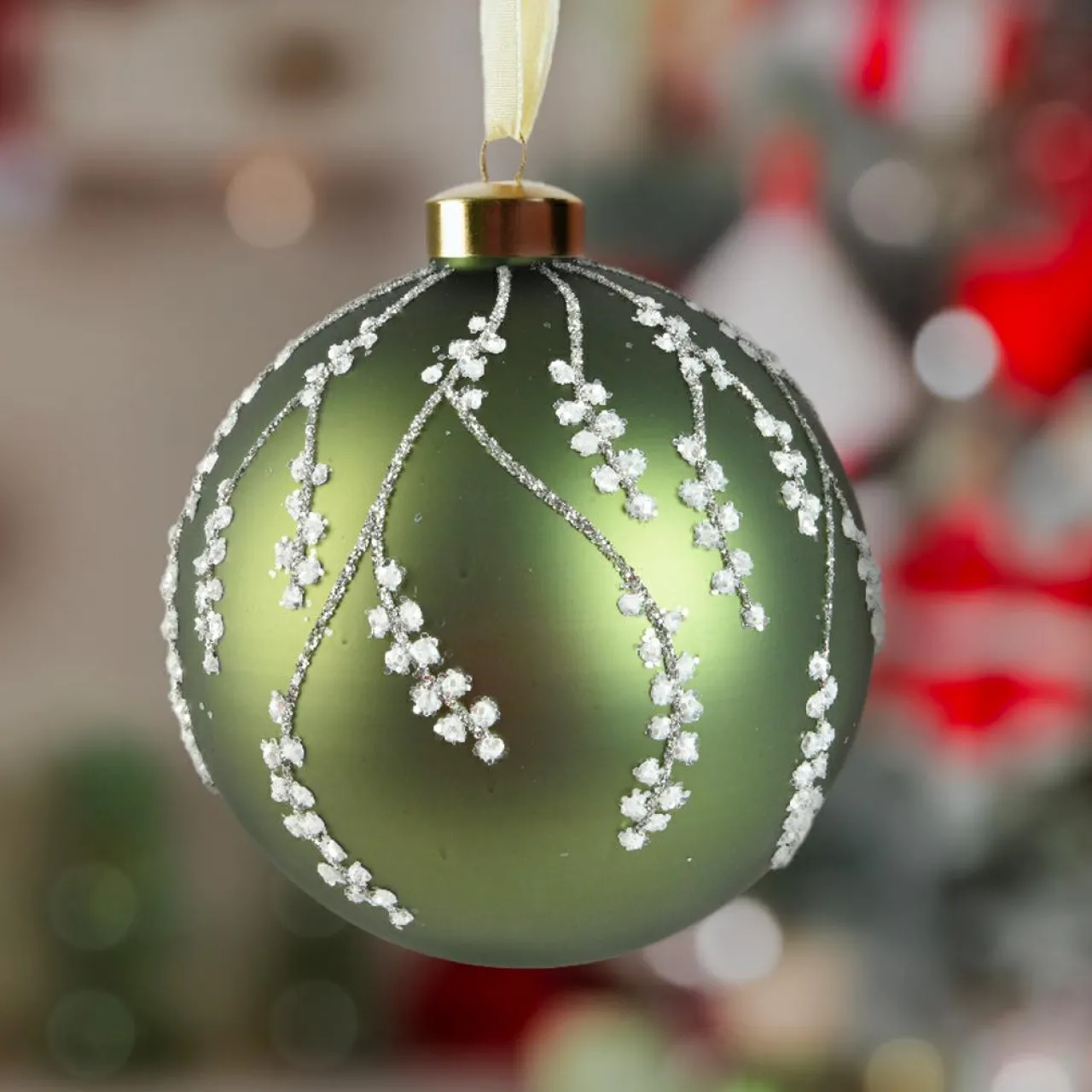 Informations complémentaires : boule vendue à l’unité. Suspension off-white wide velvet ribbon comprise, avec attache de couleur or.