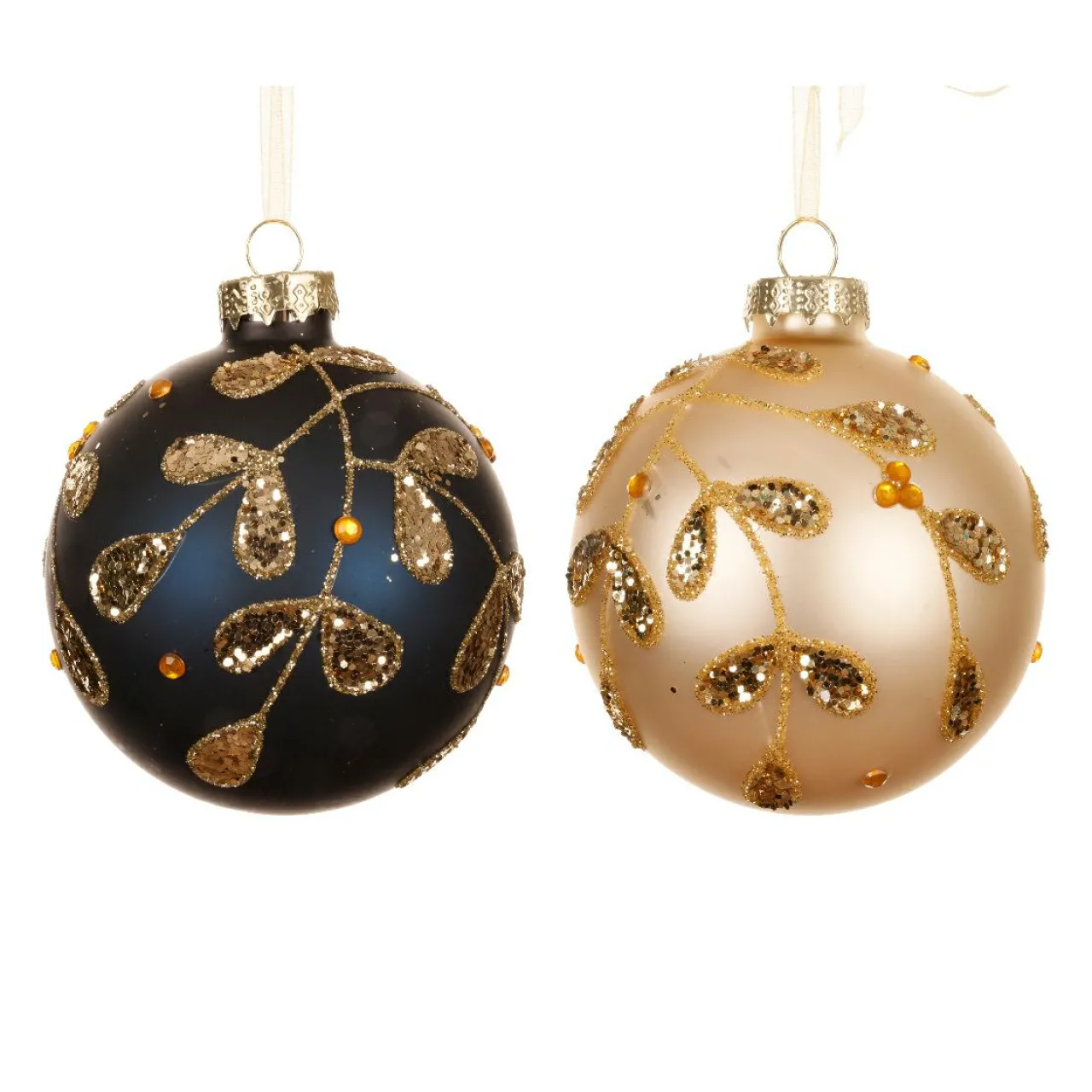 Informations complémentaires : lot de 12 boules avec 6 en bleu nuit et 6 en perle. Les boules sont munies d’une suspension comprise de couleur or.
