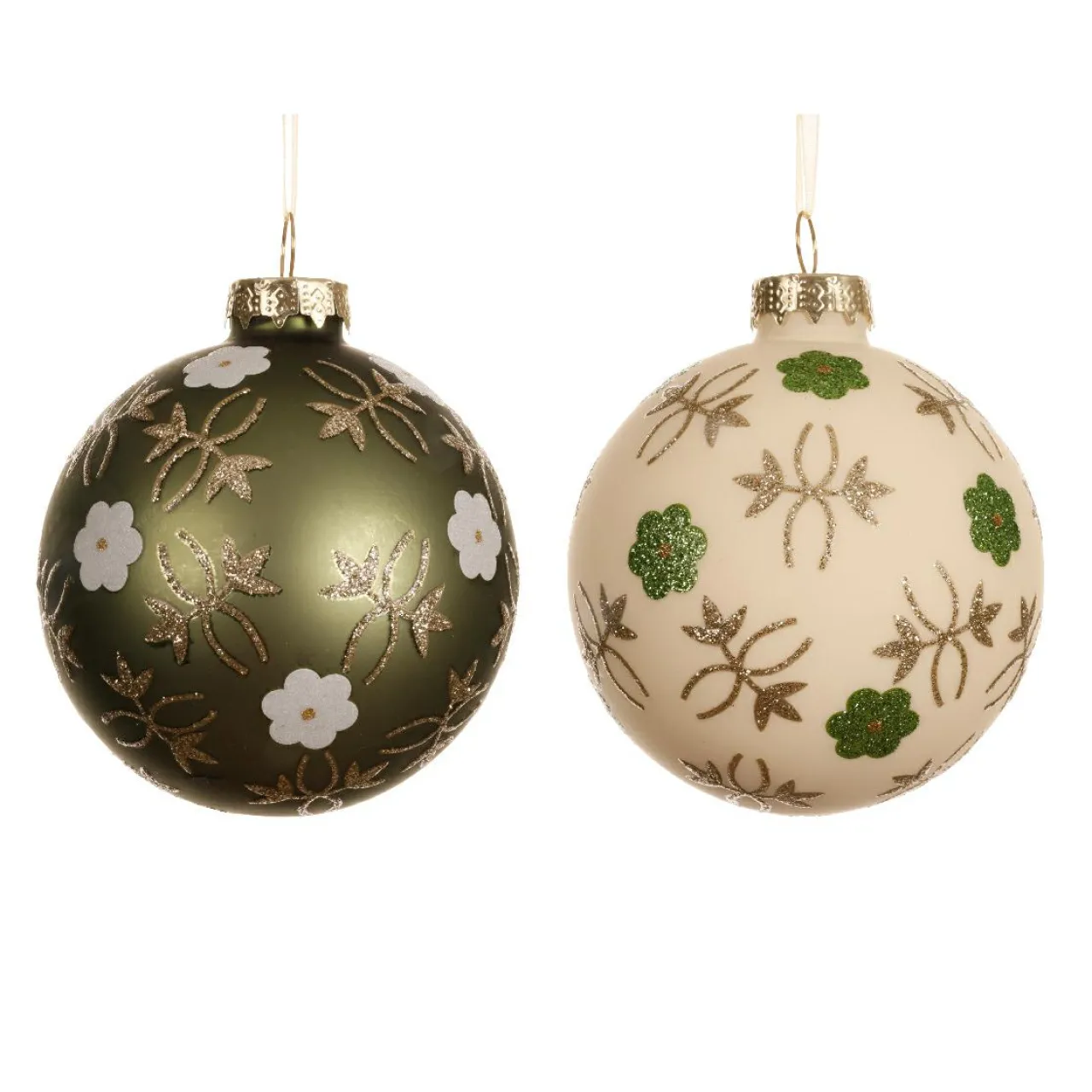 Informations complémentaires : lot de 12 boules de Noël. 6 boules de couleur blanc laine mat et 6 boules de couleur vert matcha mat. Les boules sont munies d’une suspension comprise de couleur or.