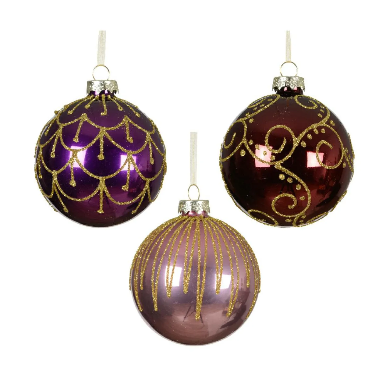 Informations complémentaires : lot de 12 boules de Noël. 4 boules de chaque couleur avec motif paillettes dorées. Suspension comprise, couleur attache or.