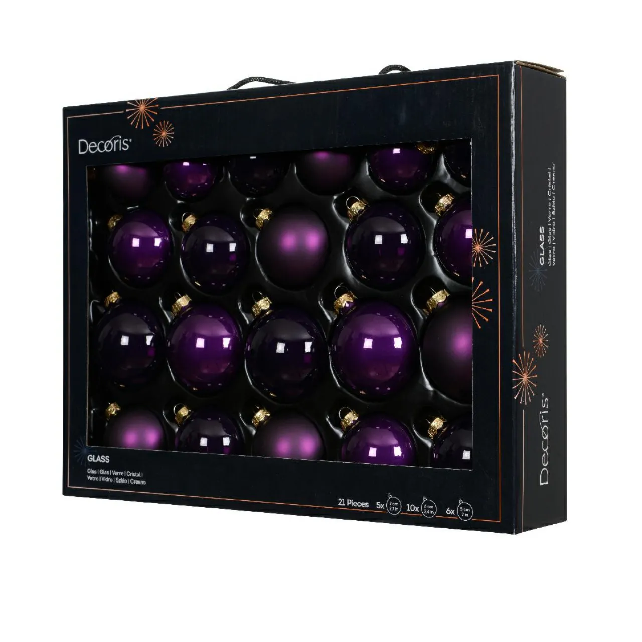 Informations complémentaires : lot de 21 boules. Finitions brillantes, transparentes et mates. Attache de couleur or incluse.