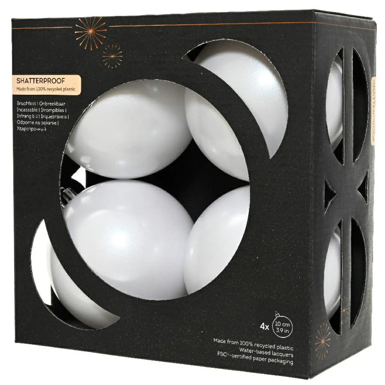 Informations complémentaires : lot de 4 boules de Noël, 2 boules brillantes et 2 boules mates. Suspension incluse, couleur argent. Emballage 100% recyclé certifié FSC.