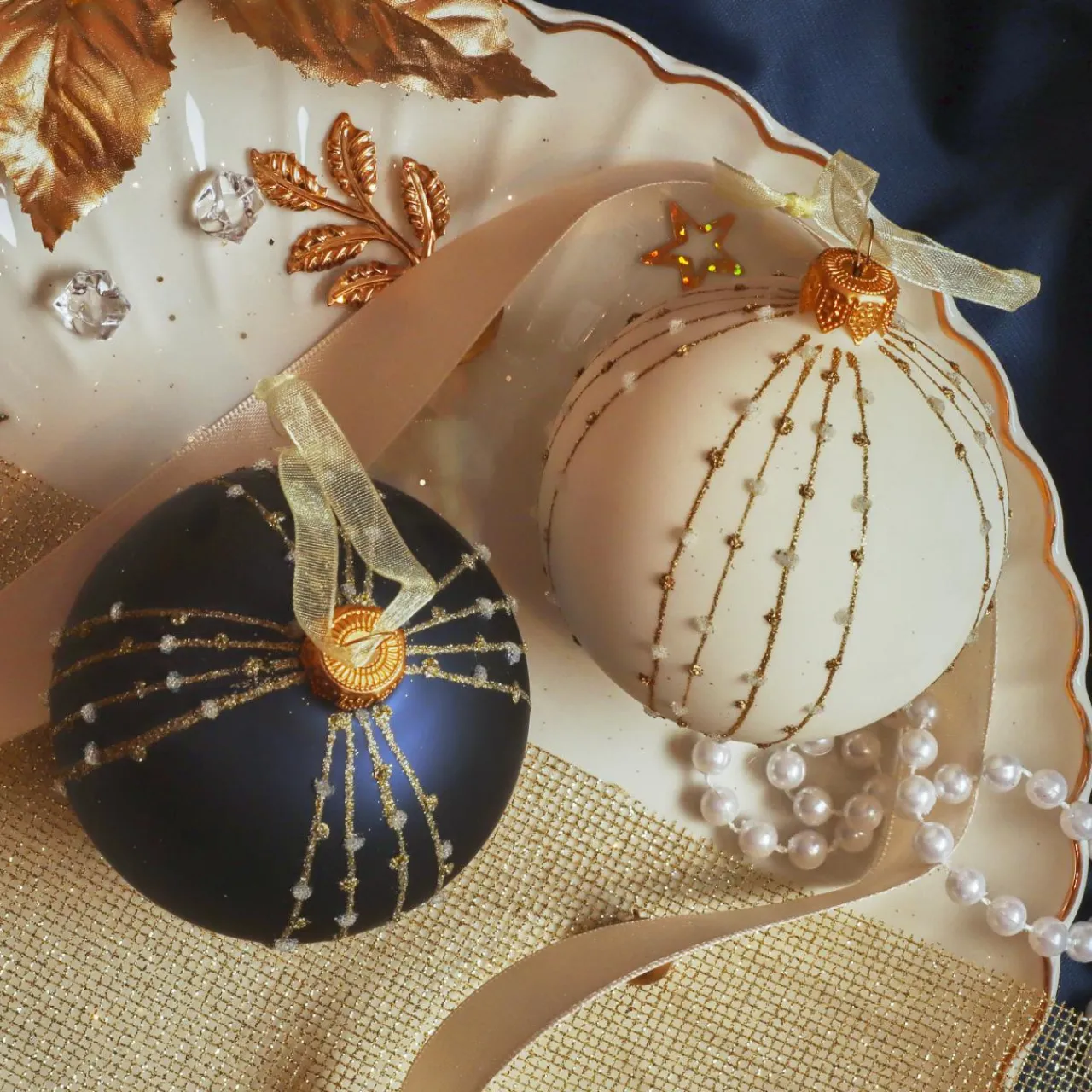 Informations complémentaires : vendu en lot de 6 boules, 3 blanc laine et 3 bleu nuit. Suspension comprise, couleur de la suspension : or.