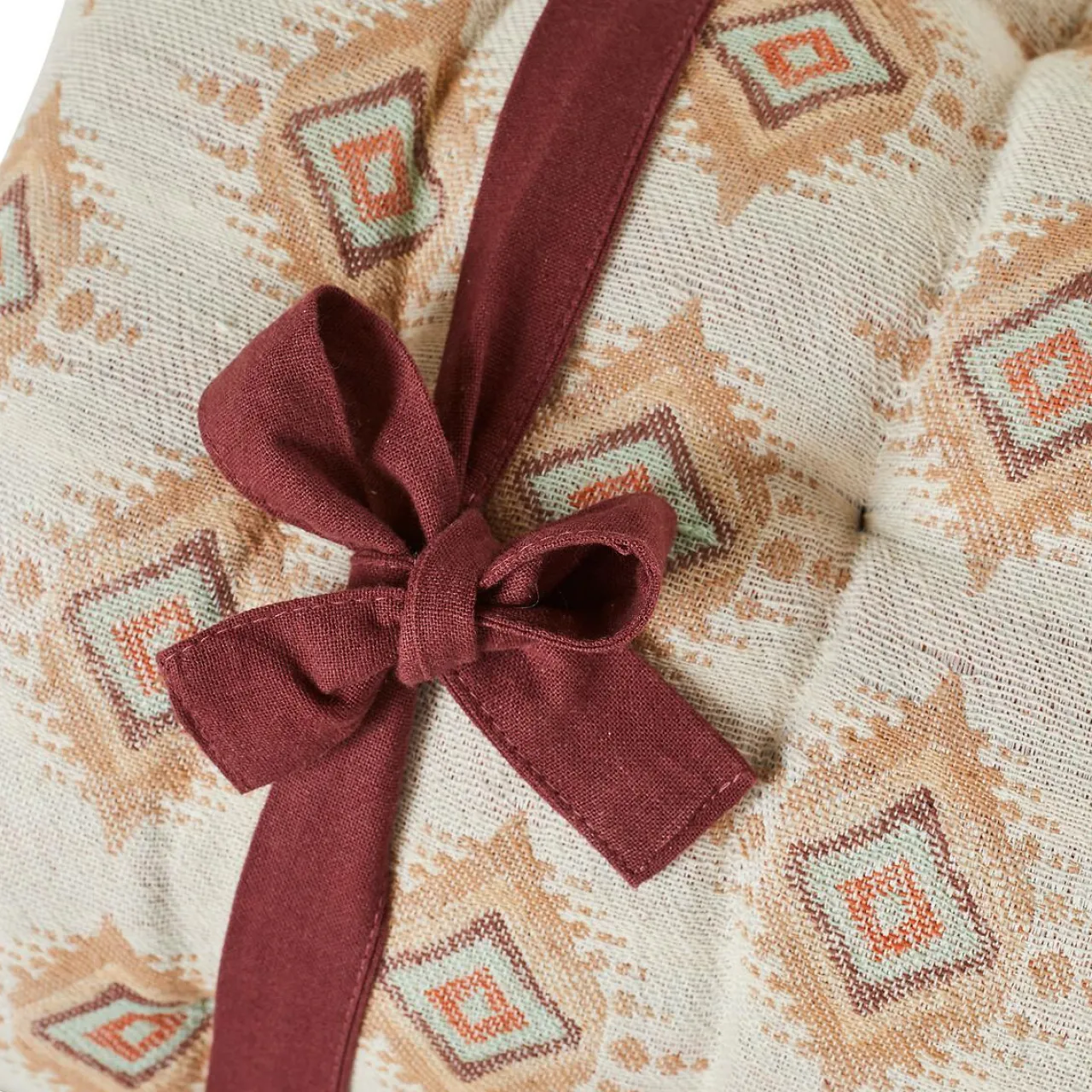 Imprimé : coussin à motif ethnique au recto et uni au verso, et à franges.