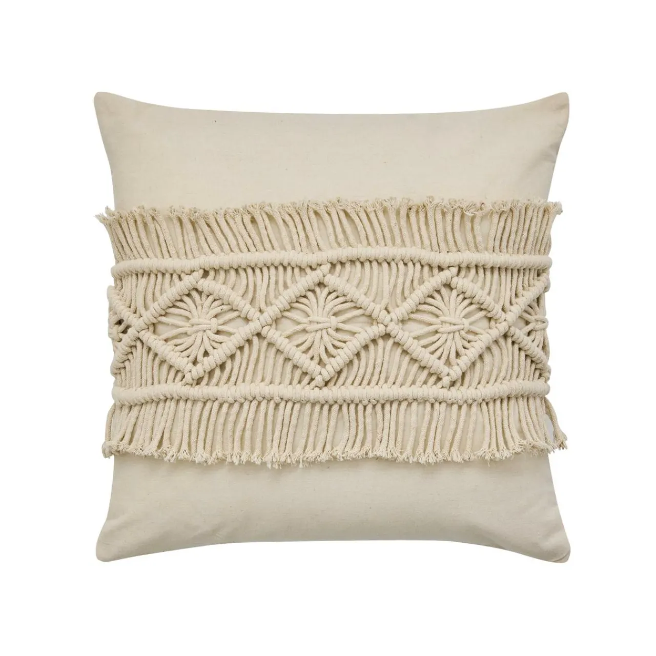 Imprimé : coussin à motif macramé au recto et uni au verso.