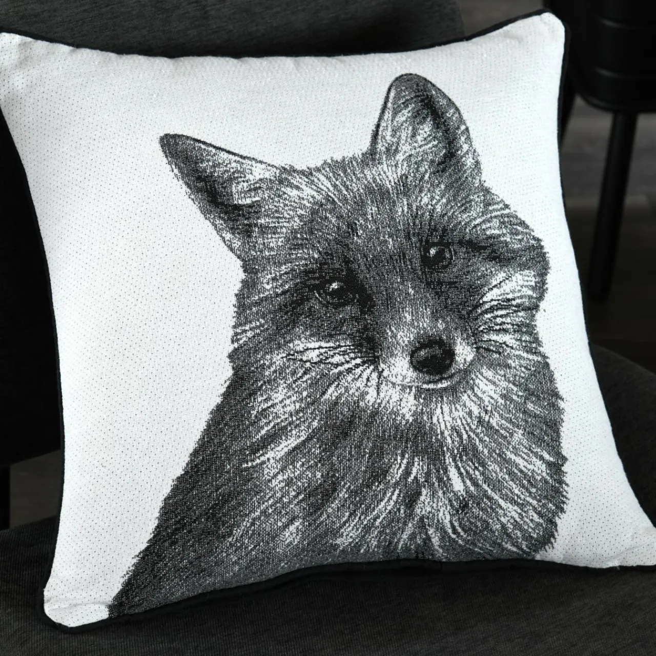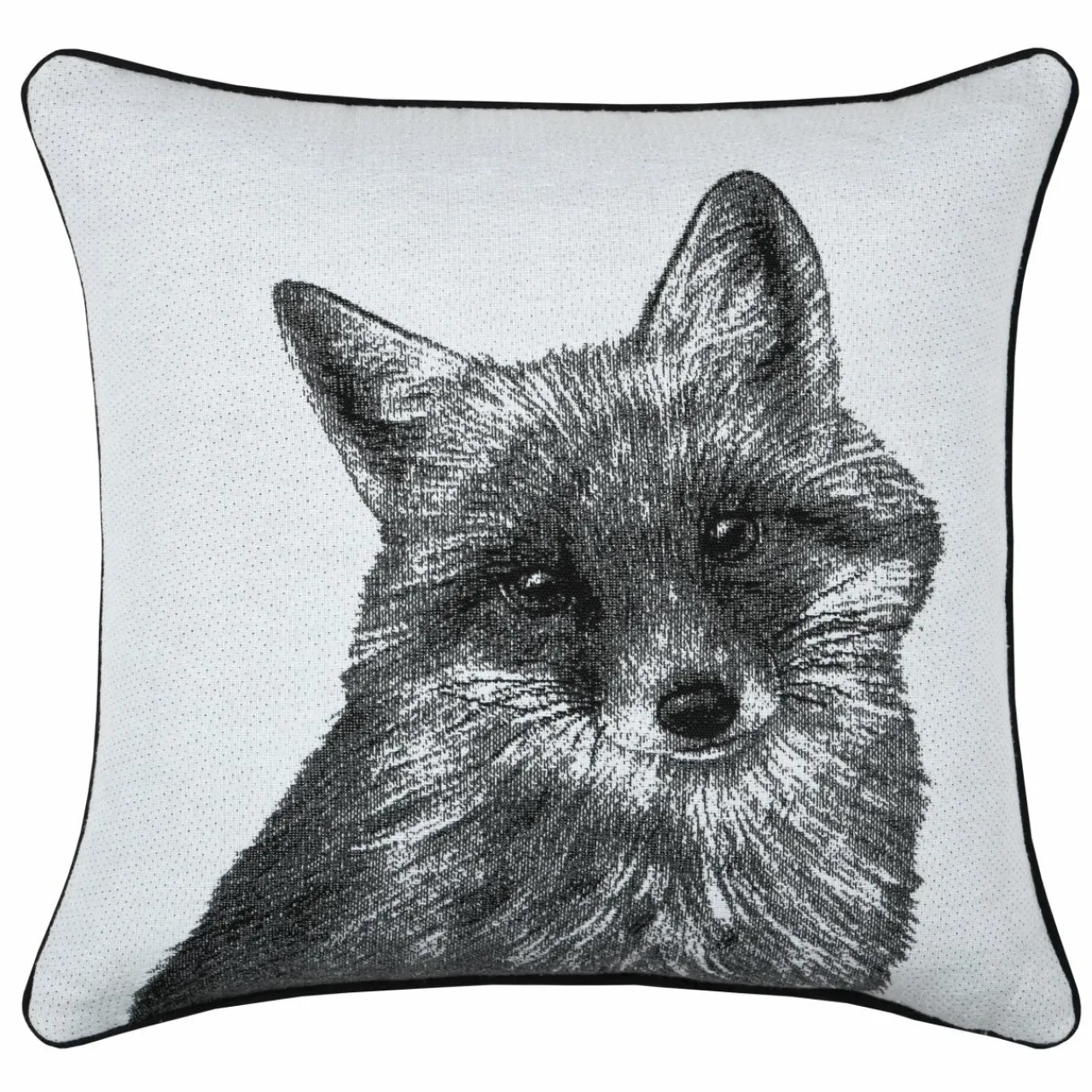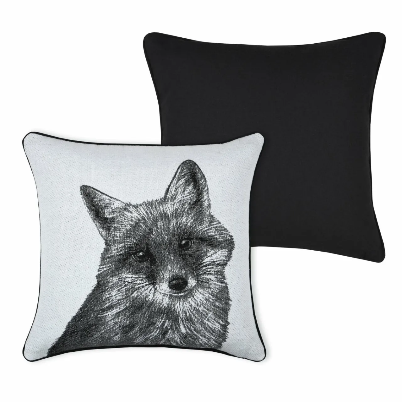 Imprimé : coussin à motif renard au recto et uni au verso.