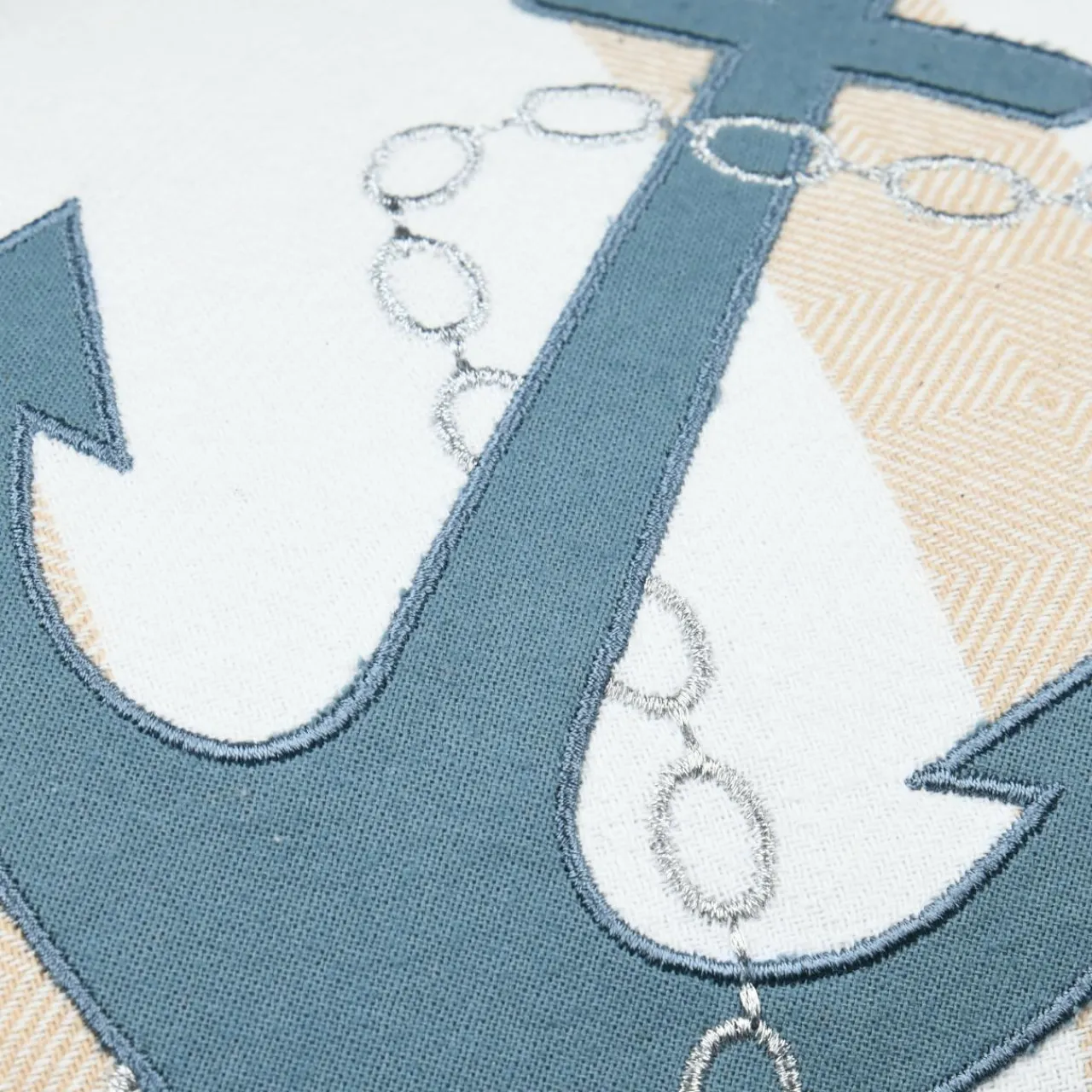 Imprimé : coussin à motif ancre marine et broderie.