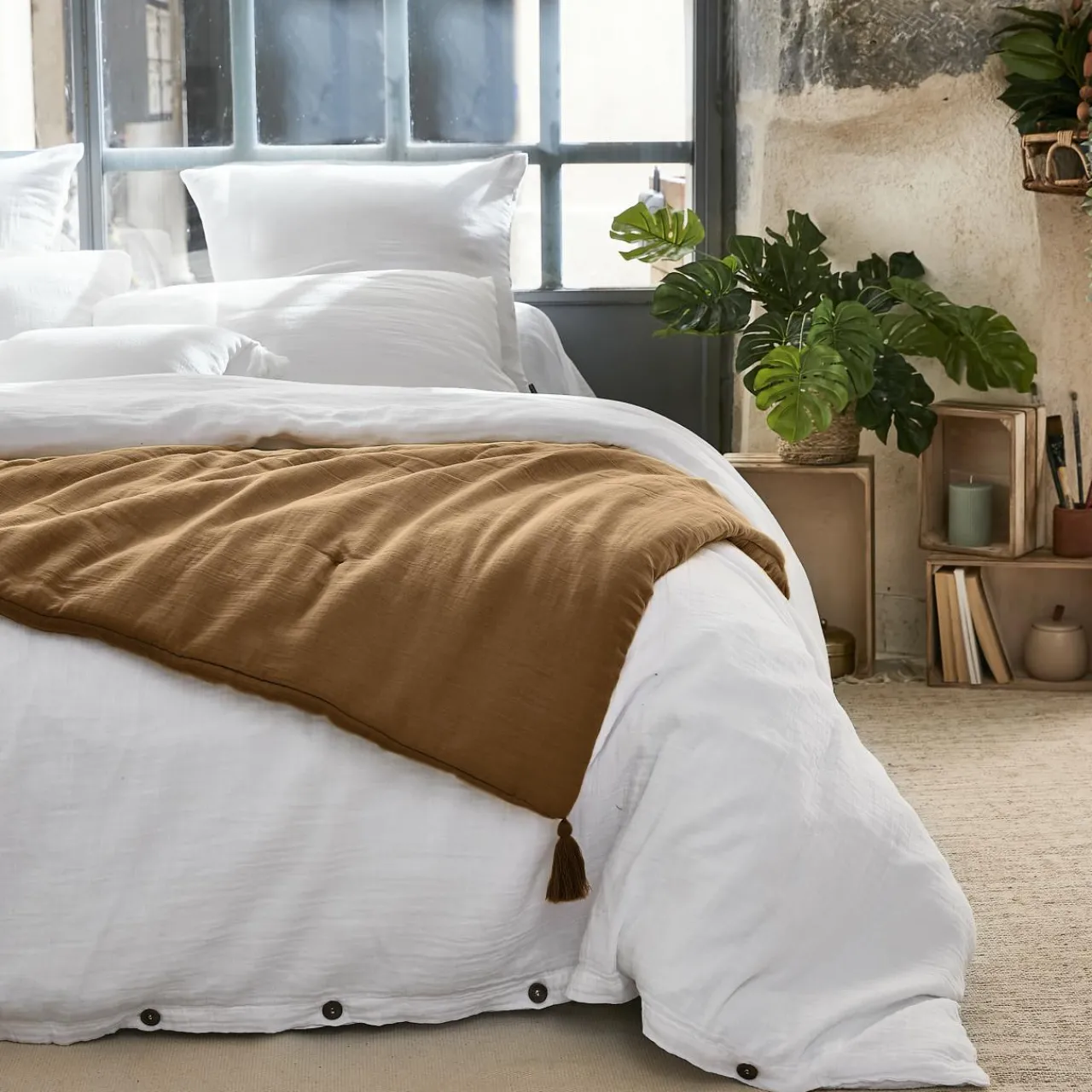 Naturellement gaufré, cet édredon en gaze de coton ne nécessite pas de repassage.