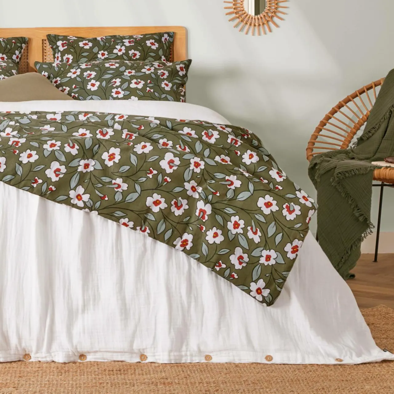 Imprimé : édredon à motif floral au recto et uni beige au verso.