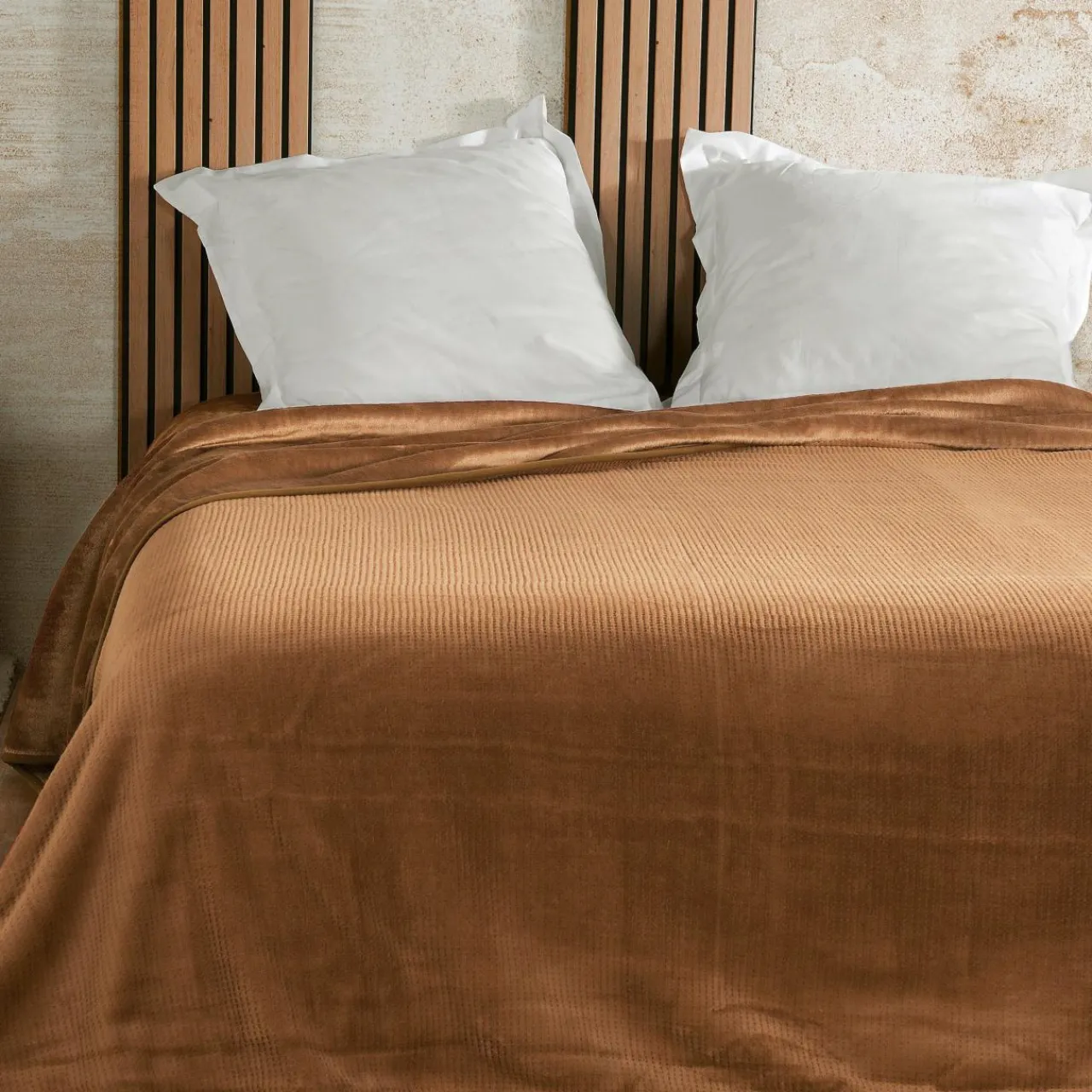 Finition : couvre lit en velours côtelé, effet nid d’abeille.
