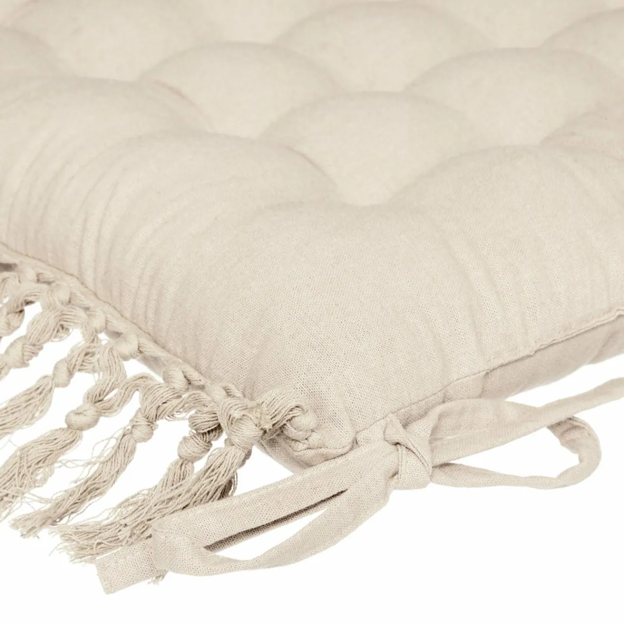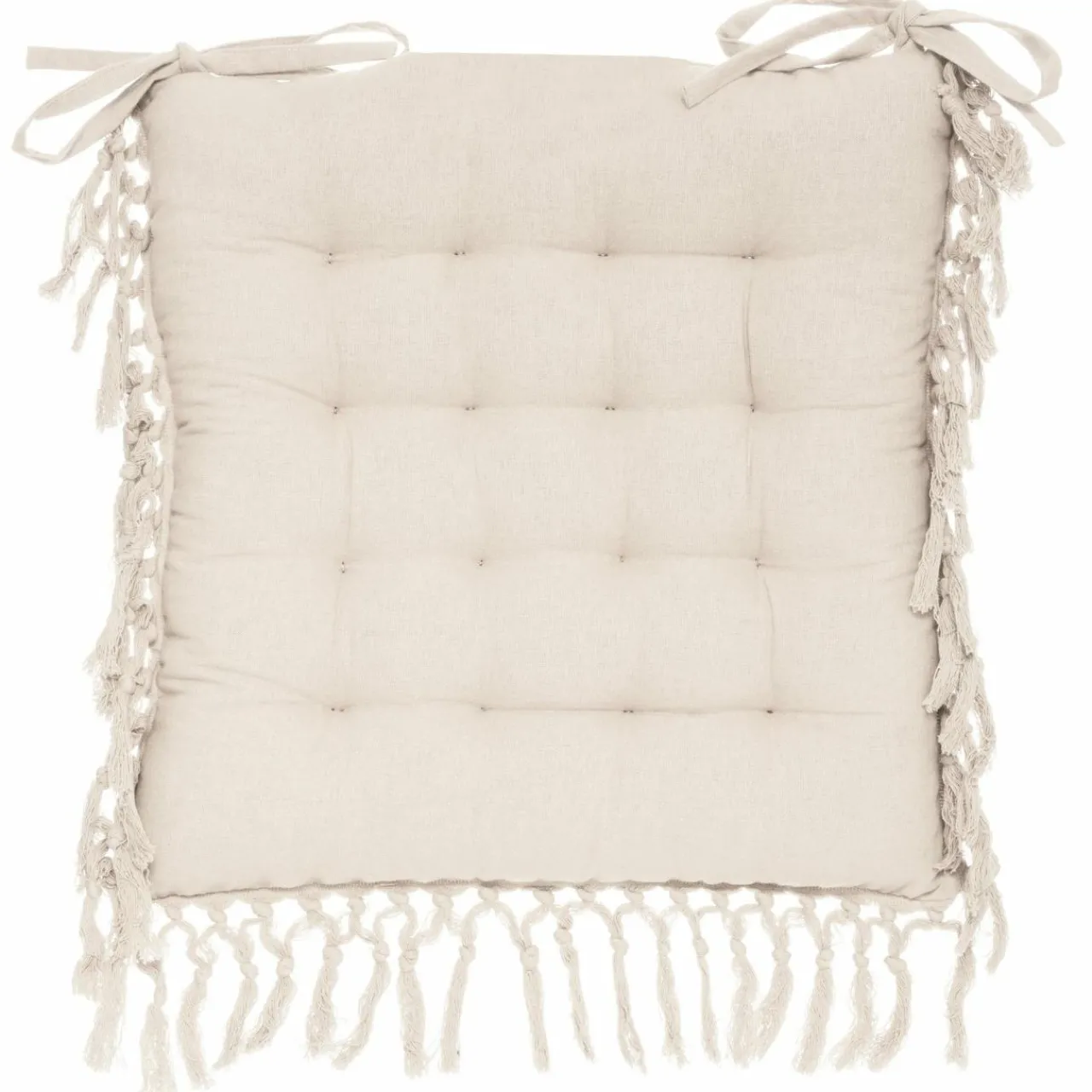 Finition : Non déhoussable, attache par nouettes au dos de la chaise. Franges en macramé.