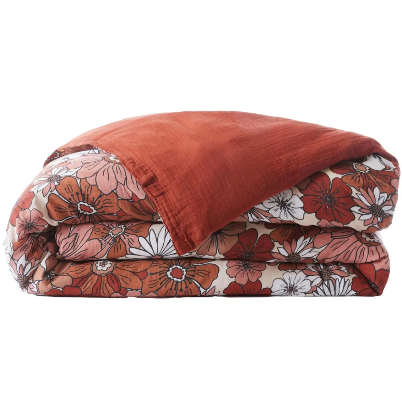 Imprimé : housse de couette à motif floral recto et unie au verso.