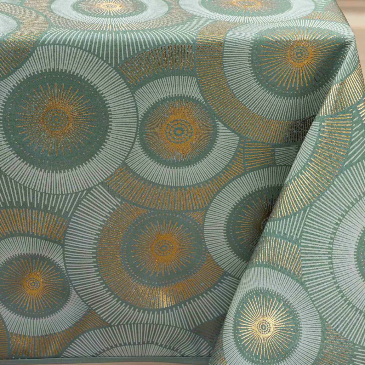 Cette nappe rectangulaire Eclipse Vert Sauge apporte une touche de modernité à votre table grâce à son motif géométrique métalisé. Elle est idéale pour créer une ambiance chic et contemporaine lors de vos repas.