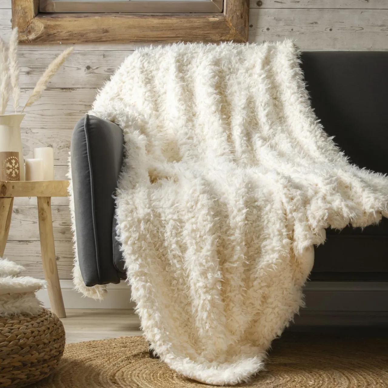 Matière : 100% polyester, effet fausse fourrure.Couleur : blanc cassé.Marque Eminza.