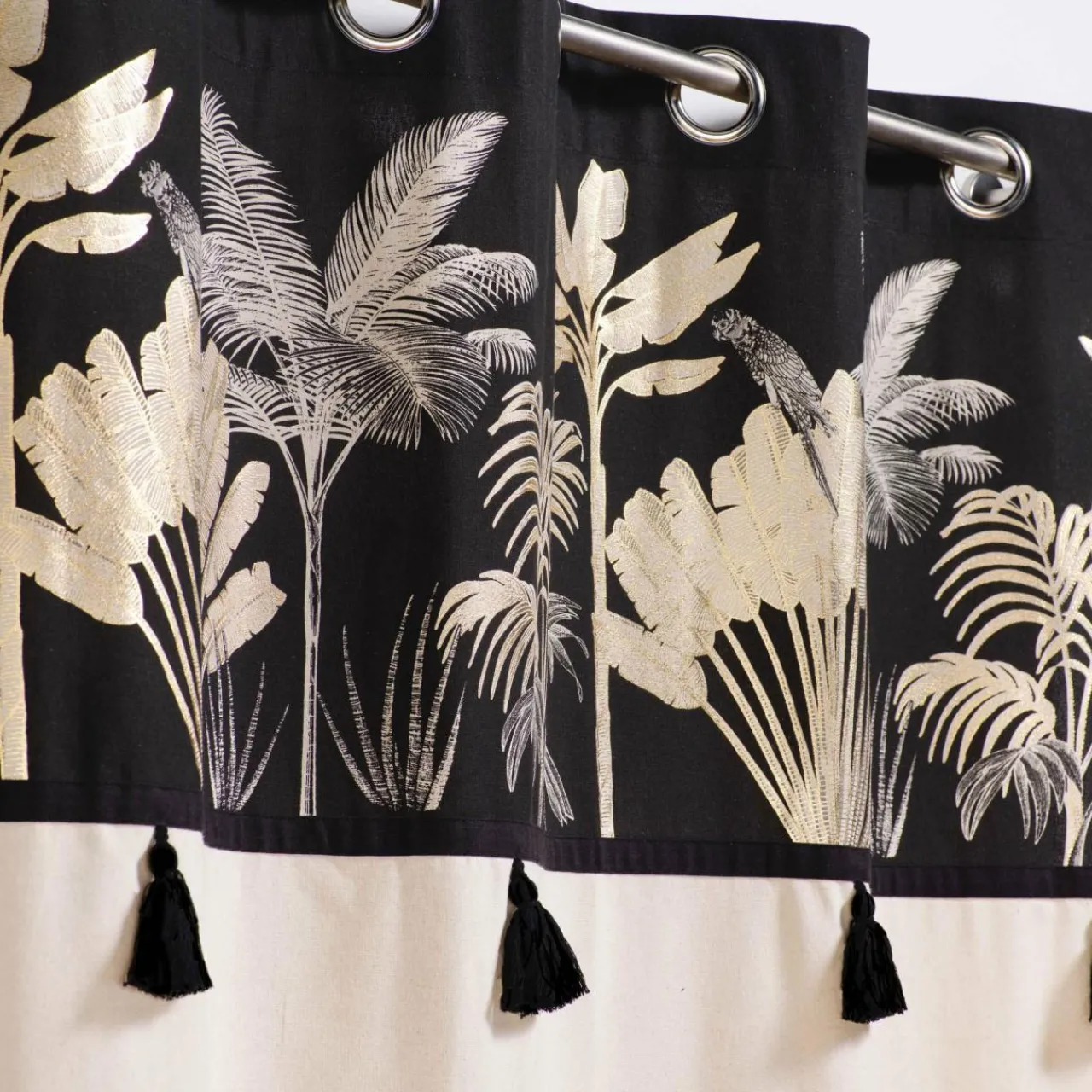 Imprimé : rideau à motif exotique et à pompons.
