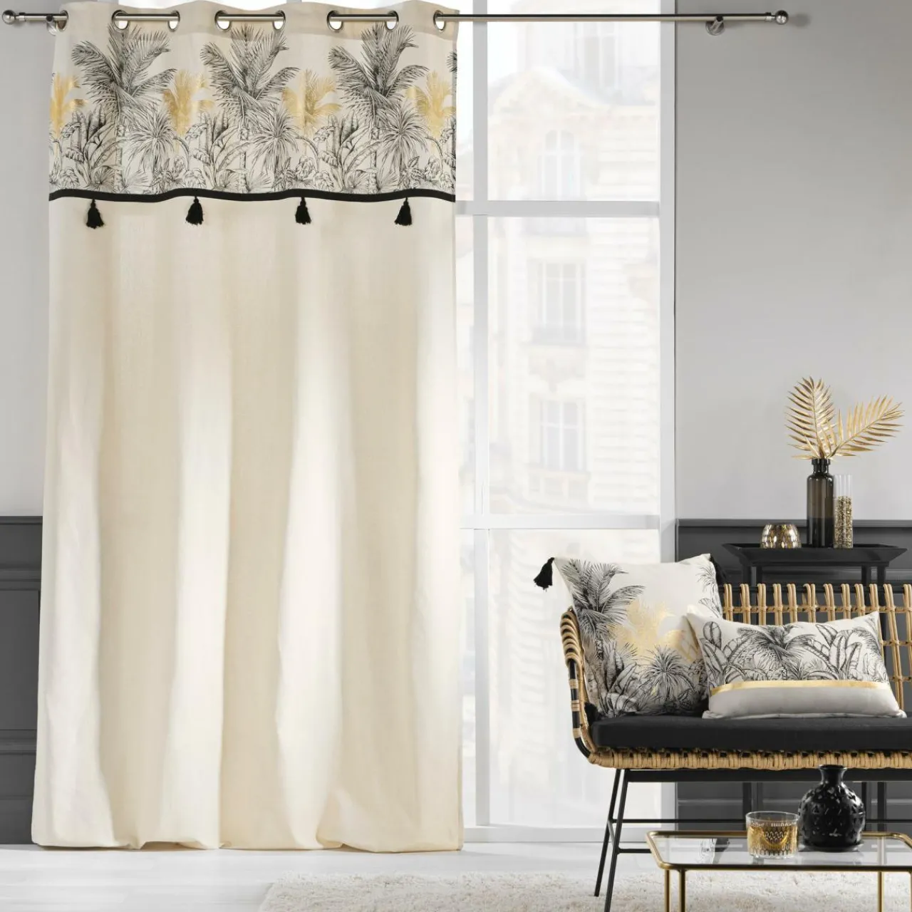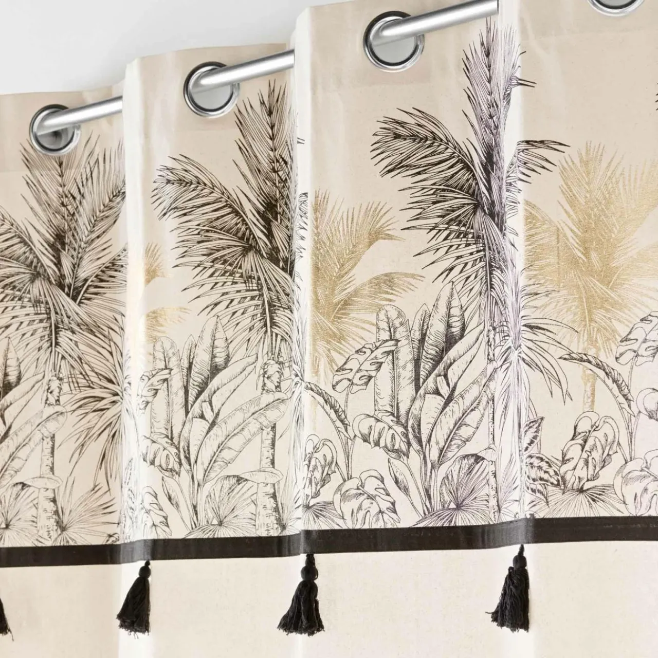 Imprimé : rideau à motif exotique et pompons.