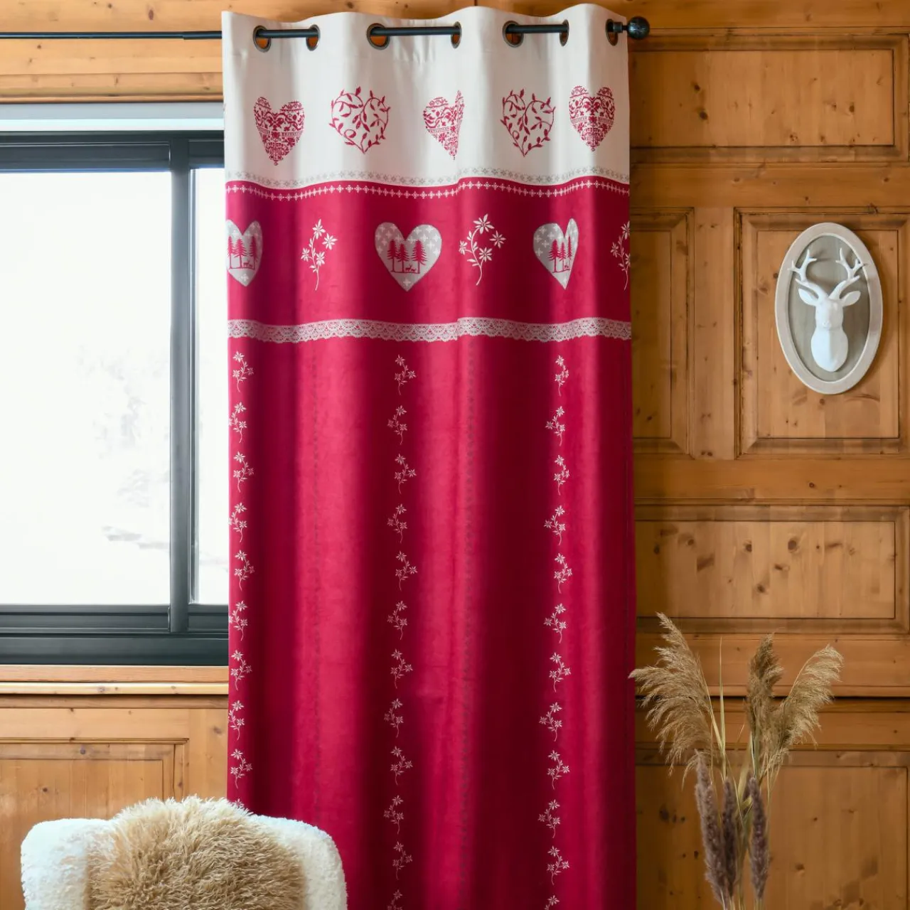 Le rideau Modane, avec son motif montagnard, apporte une touche chaleureuse de chalet à votre intérieur. Son rouge vif et ses motifs blancs créent une ambiance cosy et accueillante.
