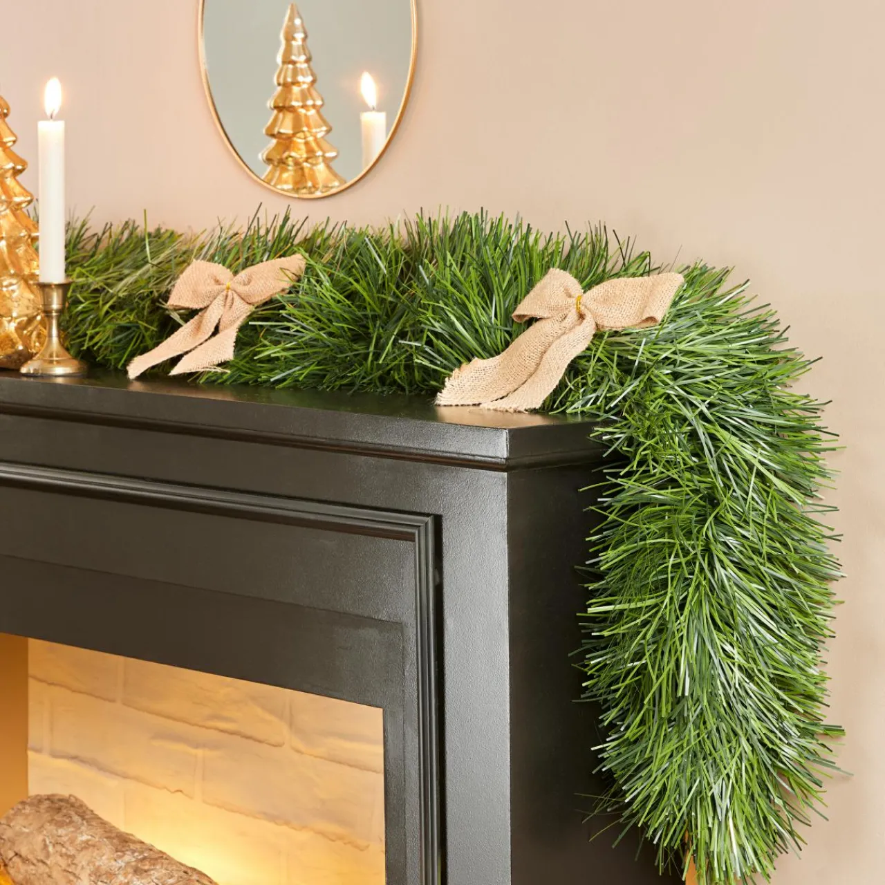 Cette grande guirlande ornée de nœud en jute, apportera une touche nature dans votre décor de Noël.
