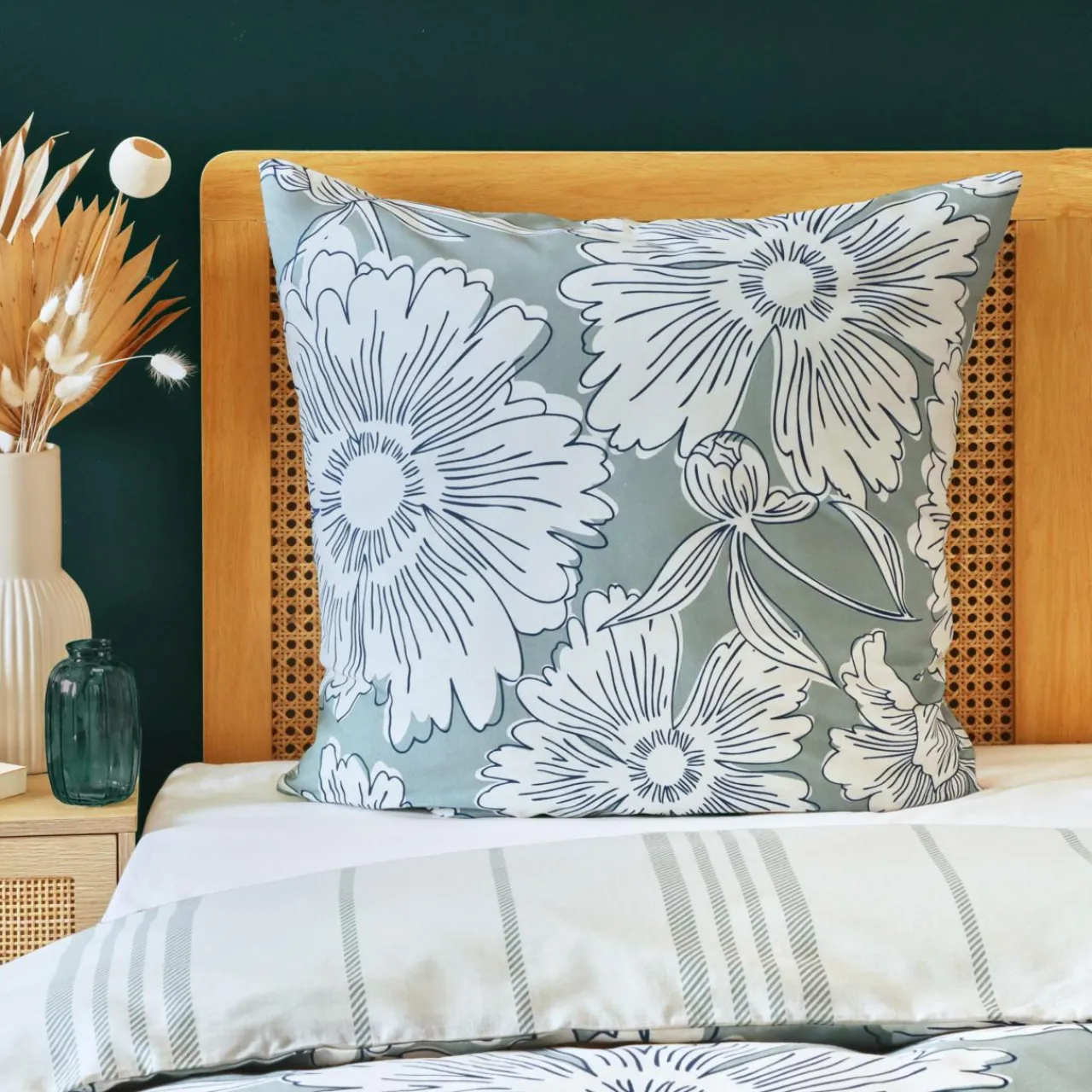 Imprimé : taie à motif floral recto et rayures verso.