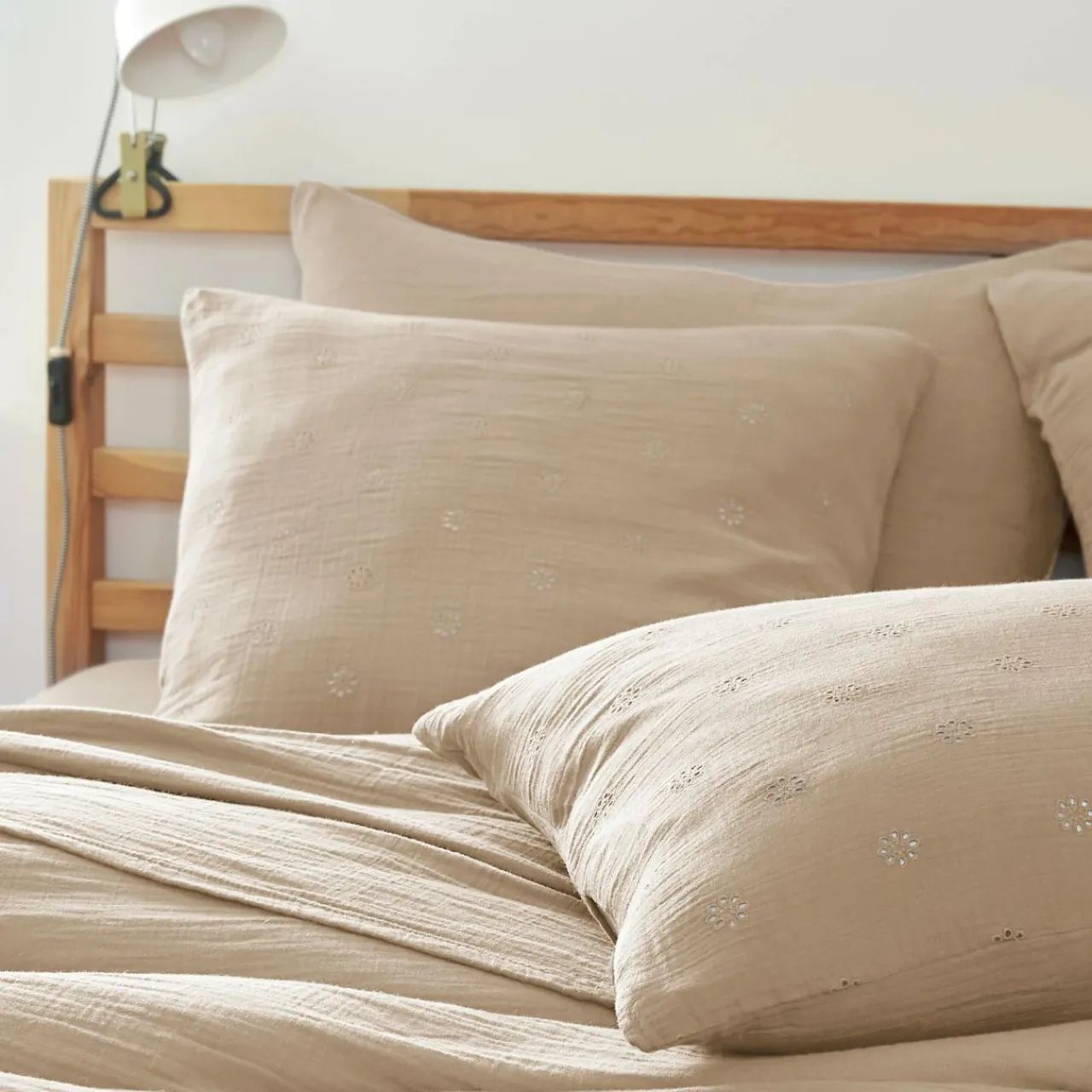 Imprimé : taie fleurie style broderie anglaise.