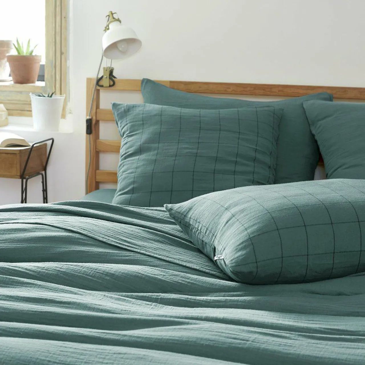Imprimé : taie à grands carreaux.