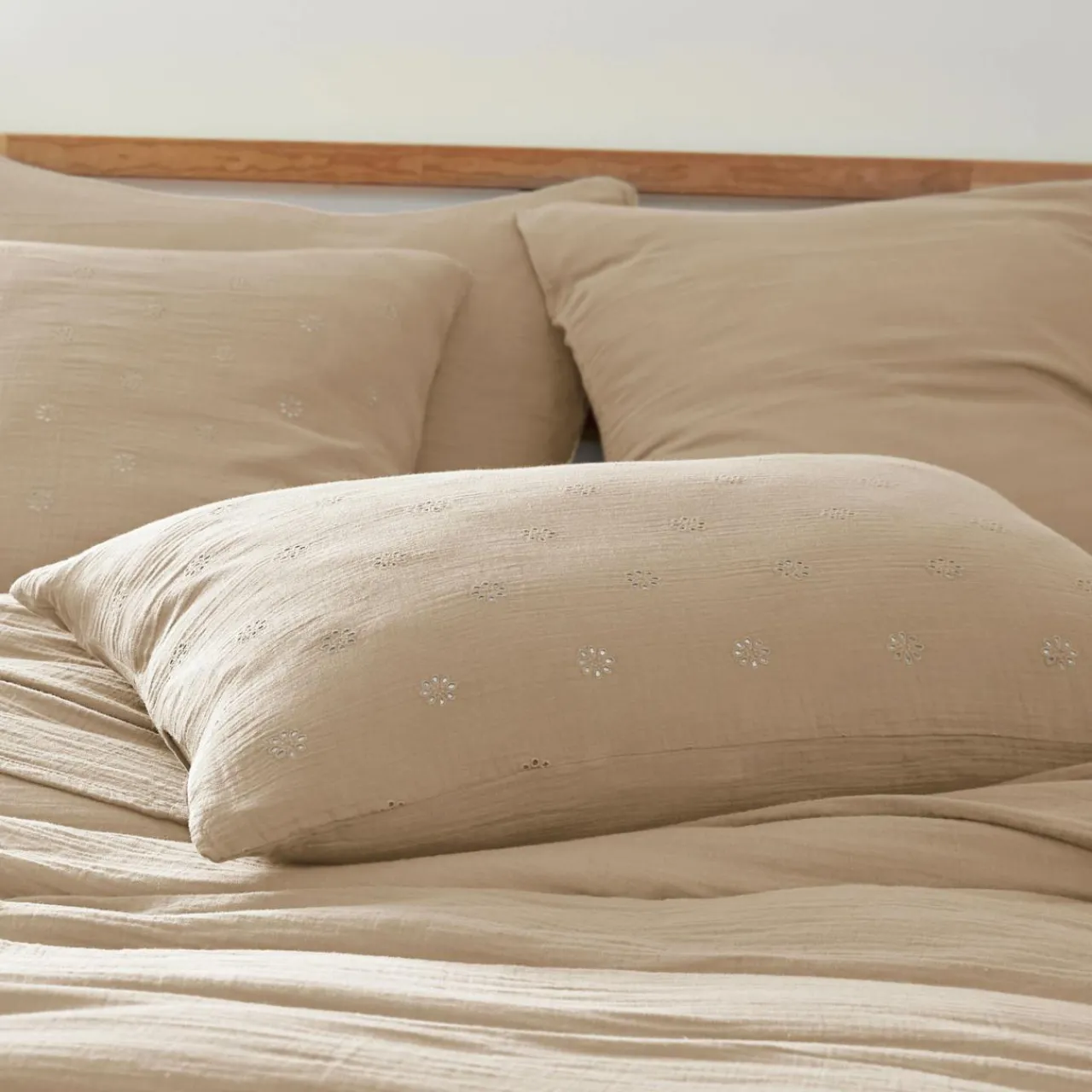 Imprimé : taie fleurie style broderie anglaise.