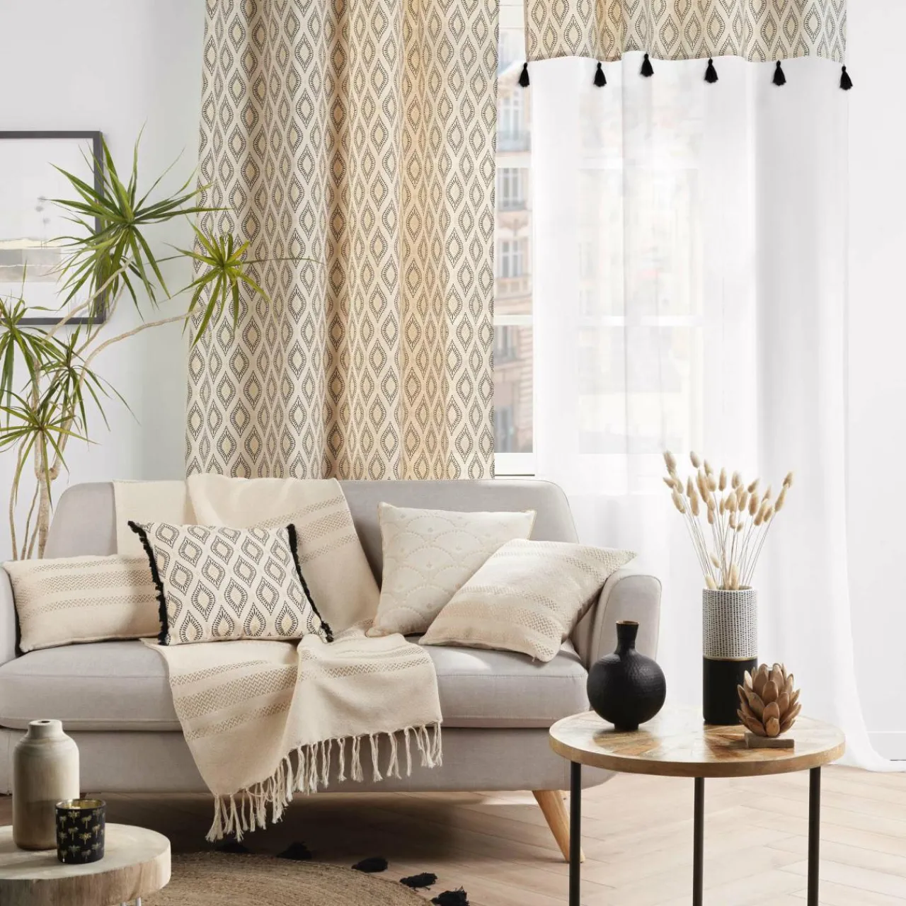Ce voilage au style ethnique et naturel se marie avec le linge de maison de la collection Oricia.