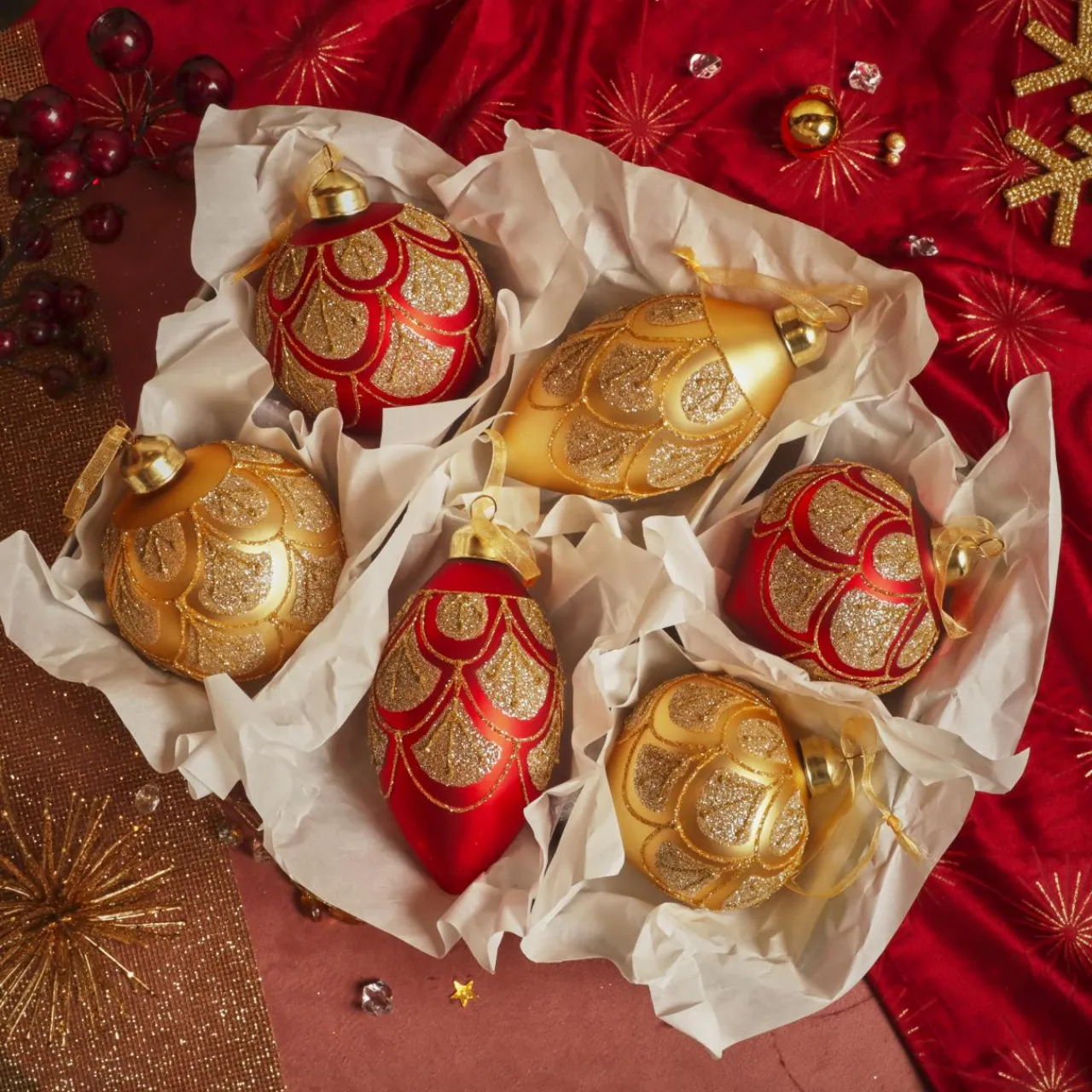 Informations complémentaires : lot de 12 boules de Noël. Les boules sont munies d’une suspension comprise de couleur or.
