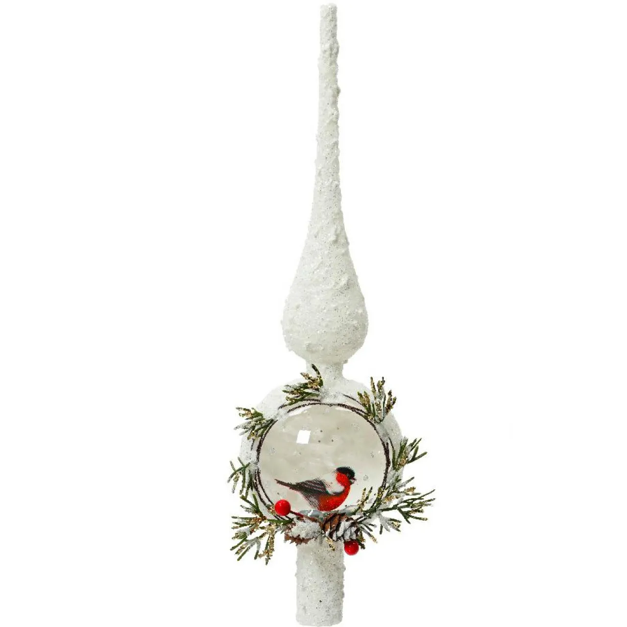 Ce cimier de sapin en verre blanc enneigé apportera une touche d’élégance à votre décoration de Noël. Ornée d’un charmant moineau et de pommes de pin, cette pièce unique soufflée à la bouche deviendra le centre d’attention de votre sapin.
