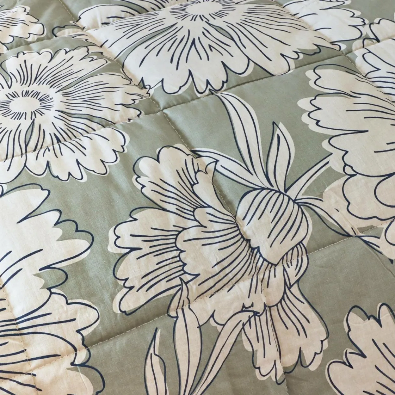 Imprimé : couette à motif floral au recto et rayures au verso.