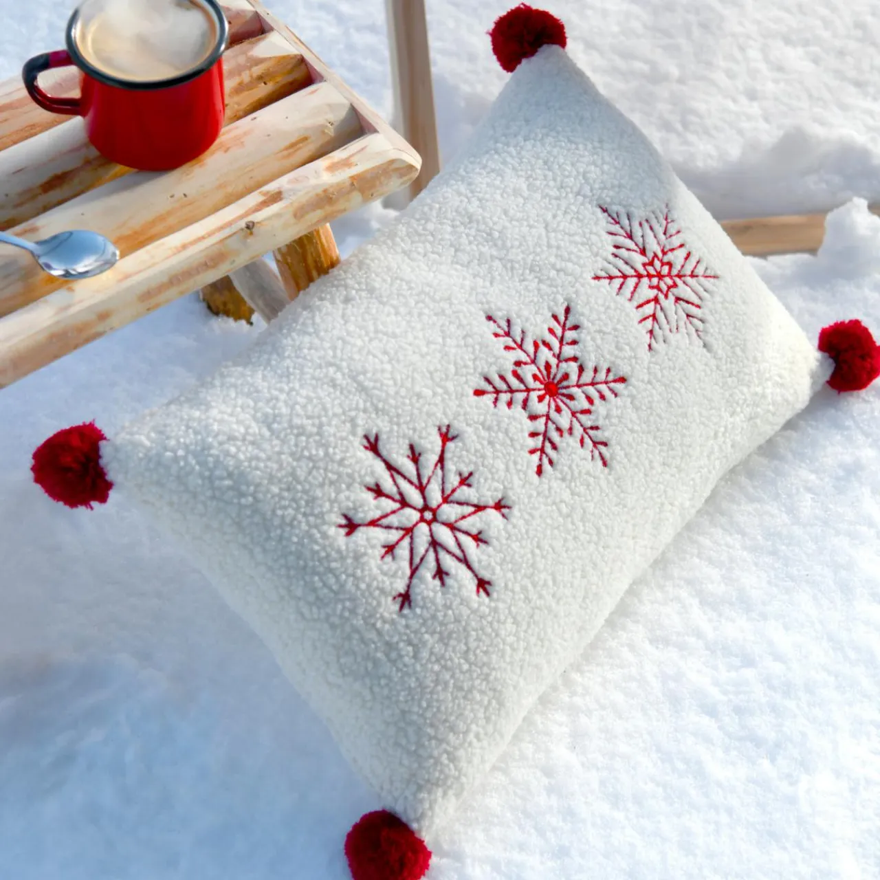 Finition : 4 pompons, broderie, déhoussable, fermeture à glissière.