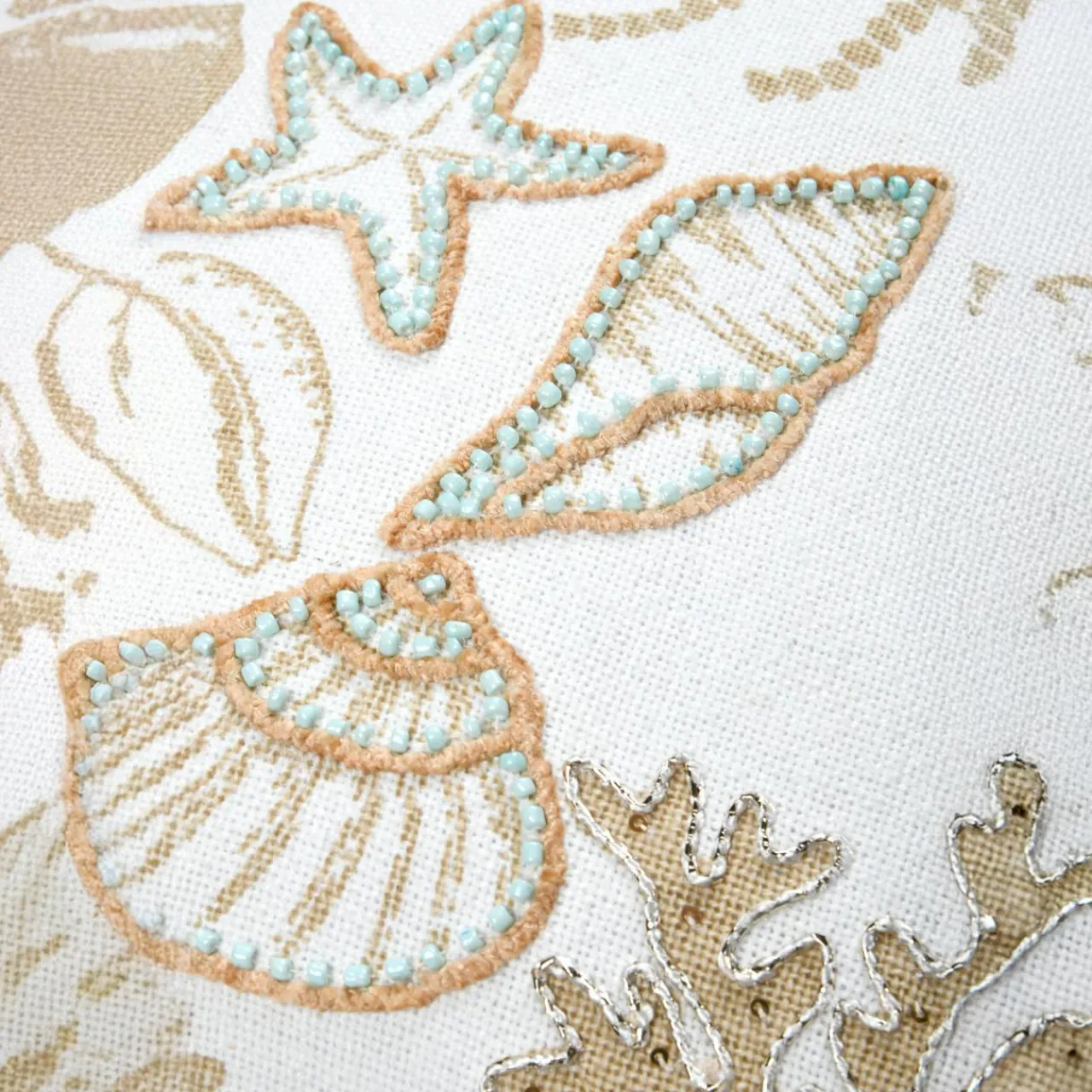 Imprimé : coussin à motifs de coquillages au recto et uni au verso.