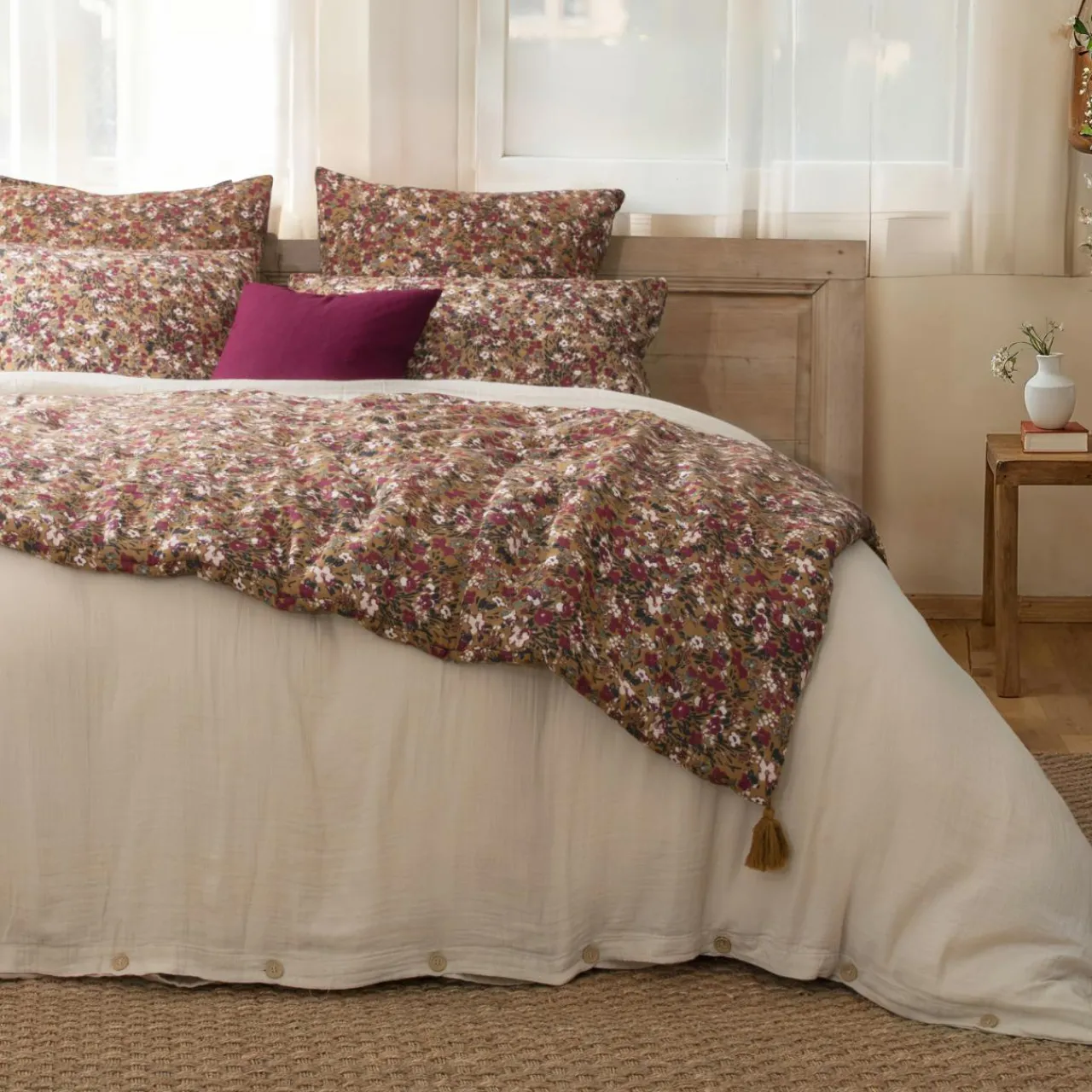 Vous pouvez, au choix, l’associer à du linge de lit en gaze de coton uni ou alors avec le linge de lit de la collection Constance by Eminza.