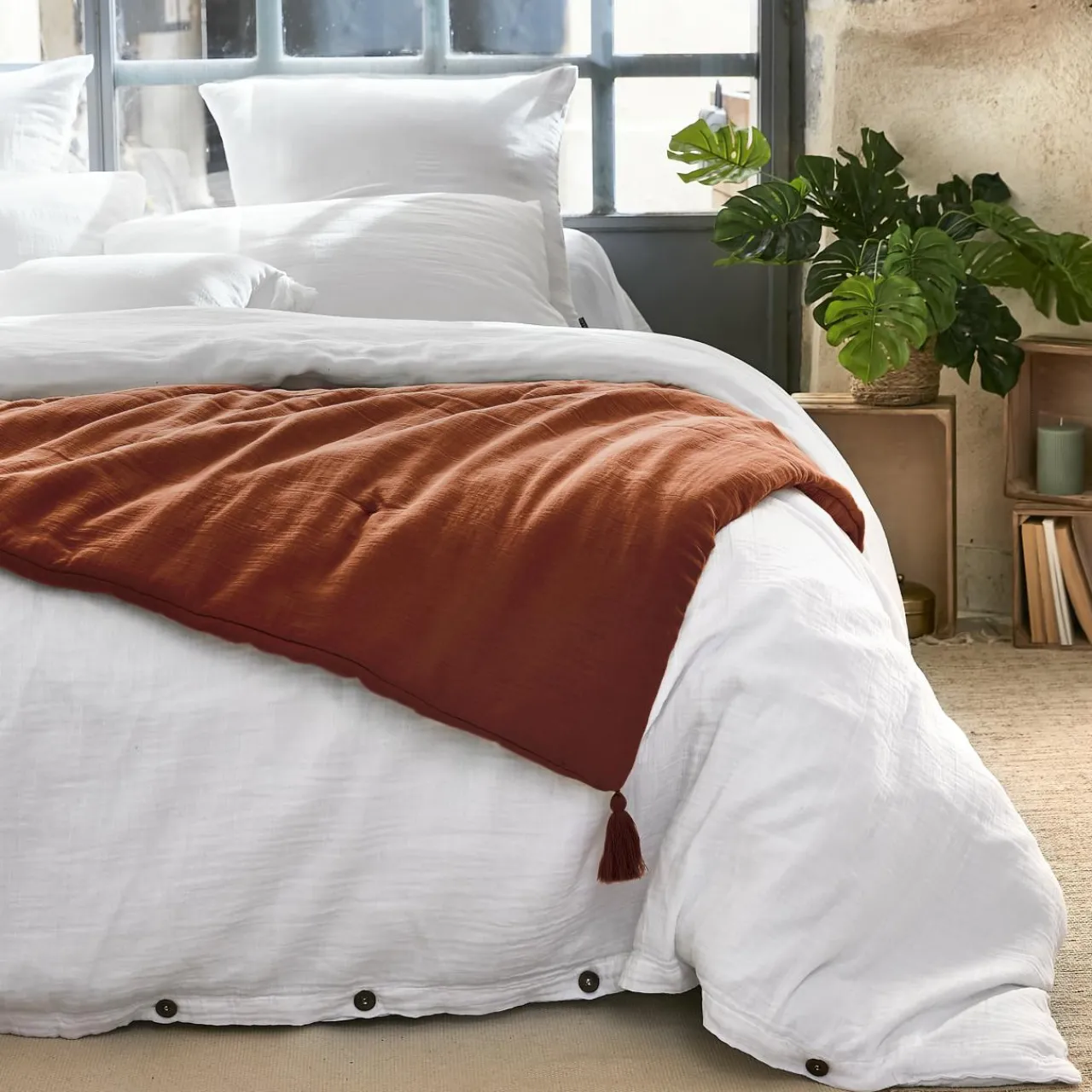 Naturellement gaufré, cet édredon en gaze de coton ne nécessite pas de repassage.