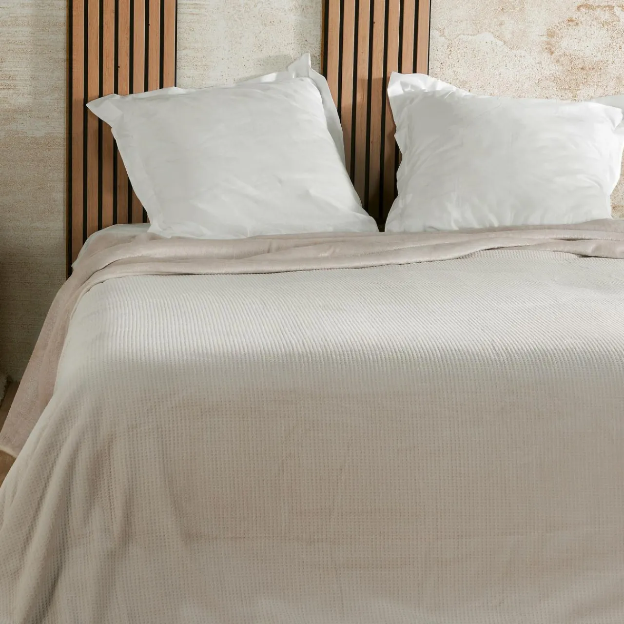 Finition : couvre lit en velours côtelé, effet nid d’abeille.