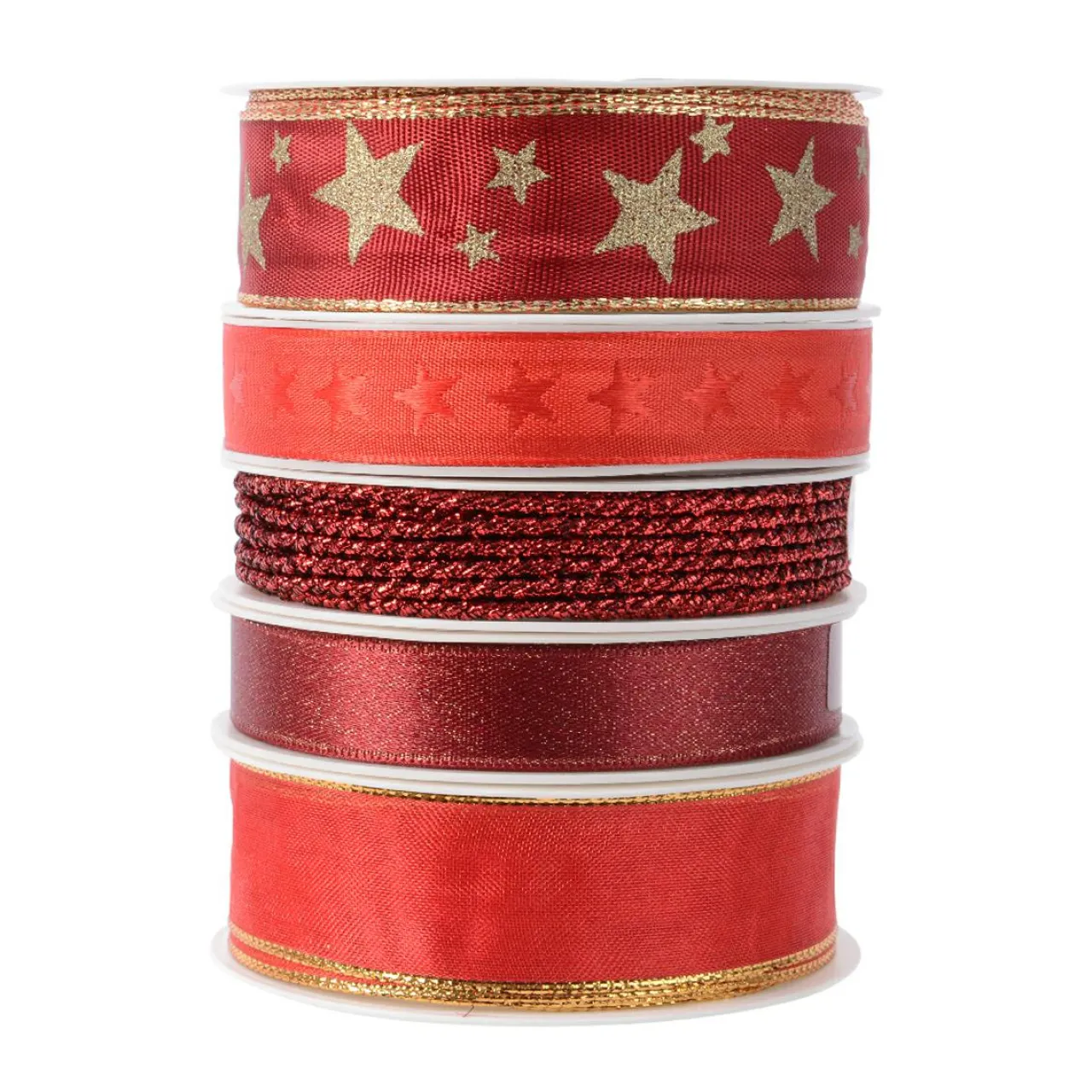 Déco De Table|KAEMINGK Lot de 5 rubans de Noël 3 m – Satin et étoiles Rouge