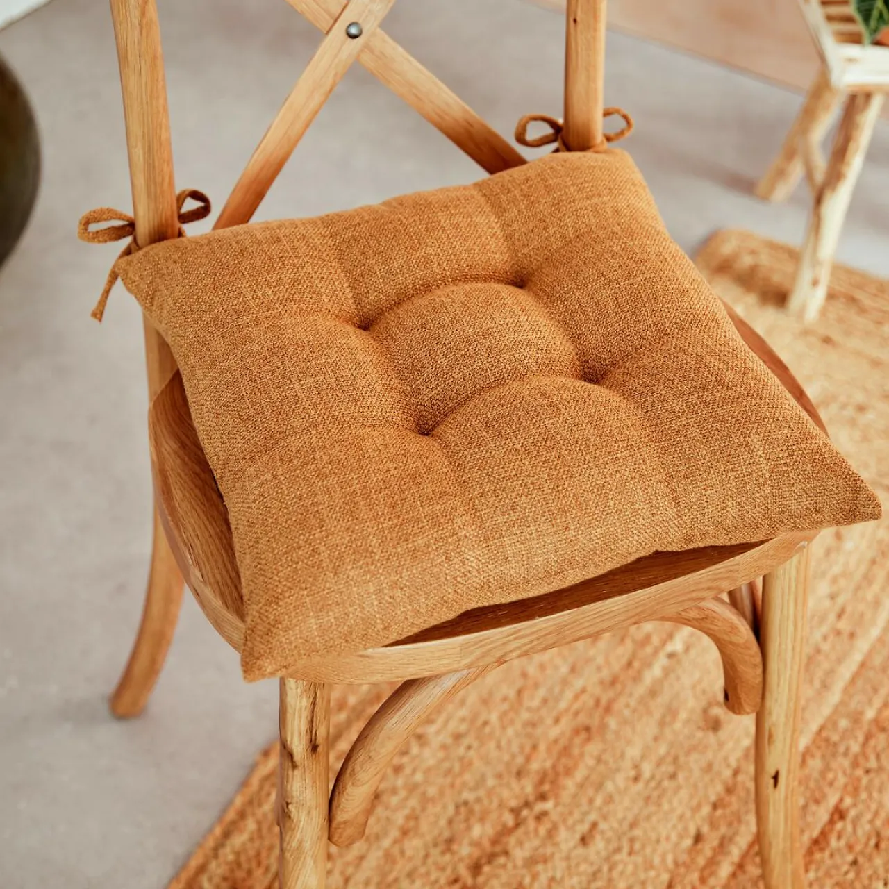 Finition : non déhoussable, piquage 4 points, attaches par nouettes au dos de la chaise.