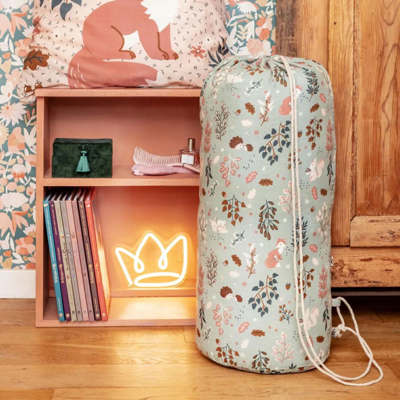 Imprimé : couette à motifs écureuils et fleurs au recto et verso.