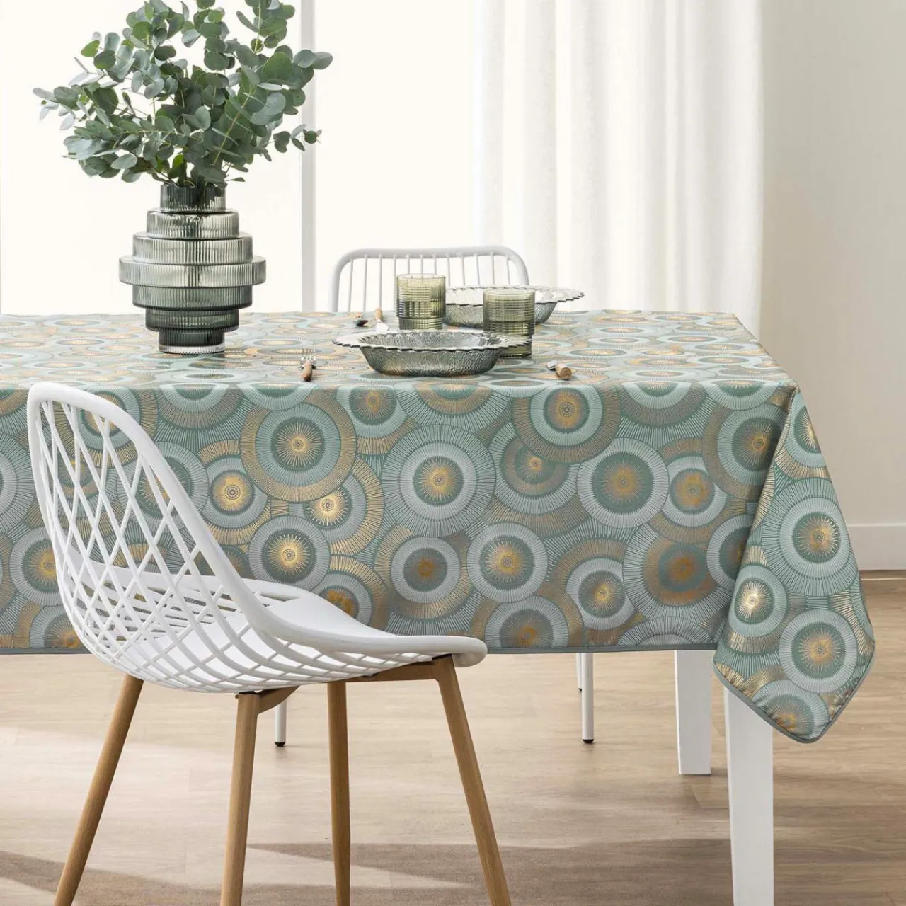 Cette nappe rectangulaire Eclipse Vert Sauge apporte une touche de modernité à votre table grâce à son motif géométrique métalisé. Elle est idéale pour créer une ambiance chic et contemporaine lors de vos repas.