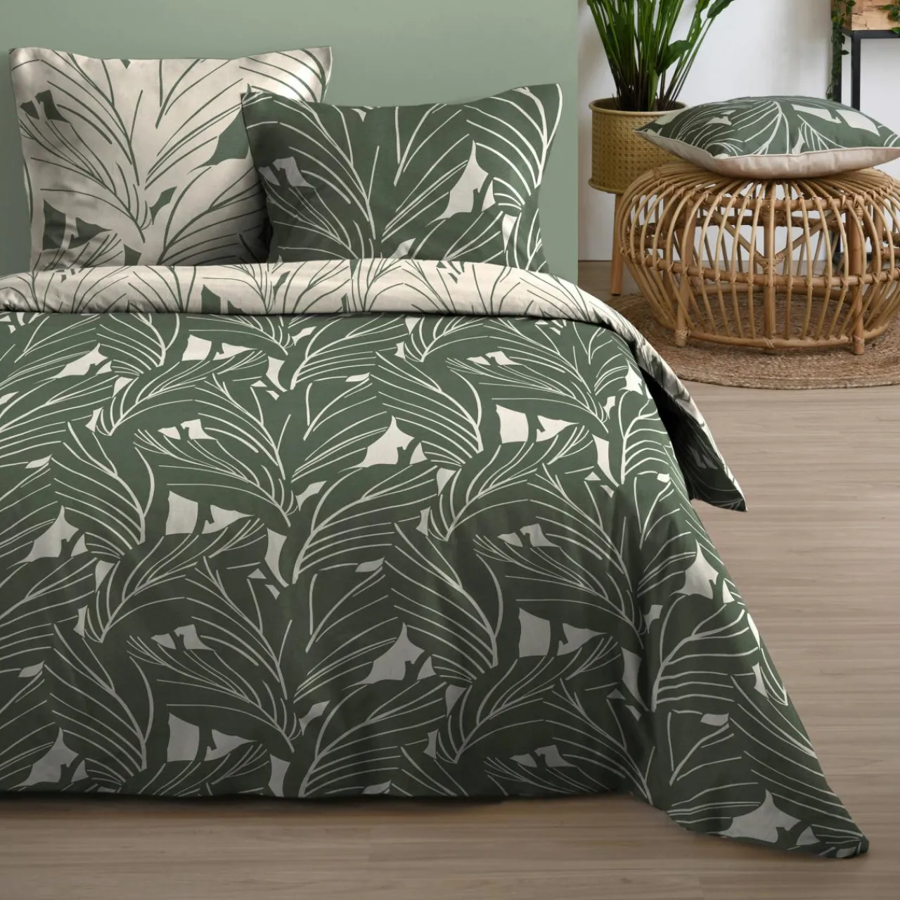 Imprimé : housse de couette à motif feuillage exotique.