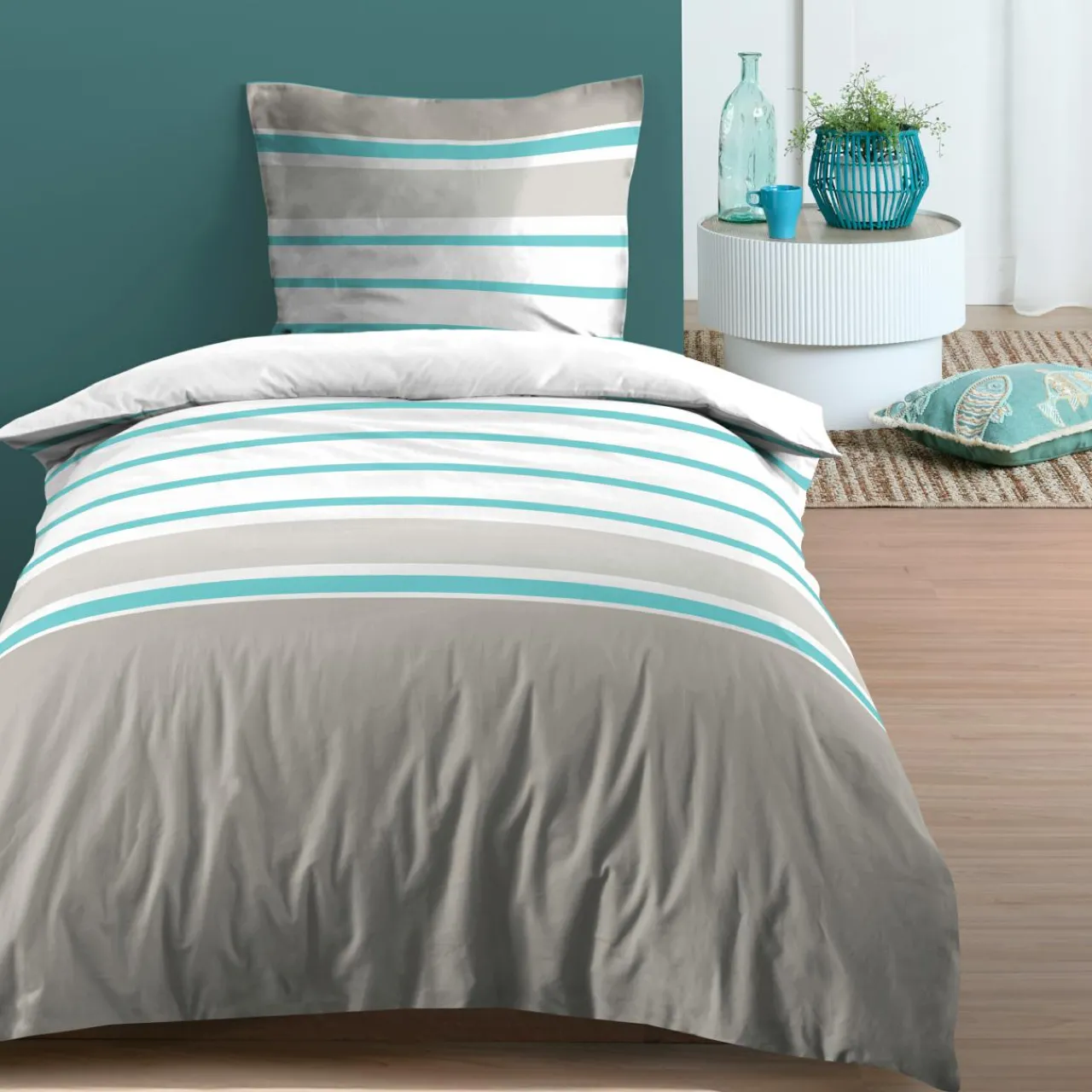 Offrez-vous une nuit de sommeil paisible avec cette parure de lit en coton. Son motif rayé gris et vert céladon évoque une brise marine rafraîchissante, apportant une sensation de douceur et de confort inégalée. Son design élégant et apaisant transformera votre chambre en un véritable havre de paix.