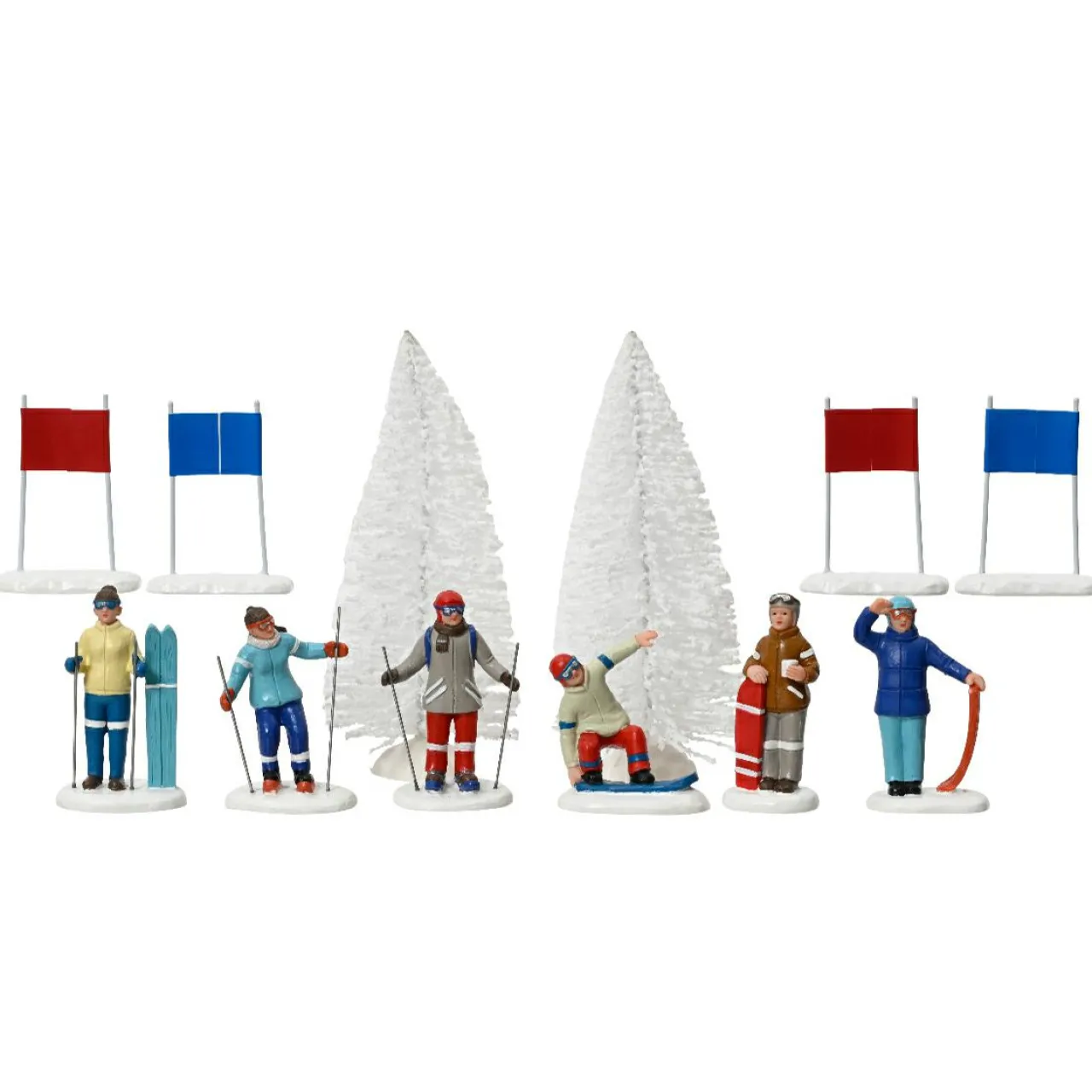 Lot comprenant 2 sapins, 6 skieurs et 4 drapeaux.