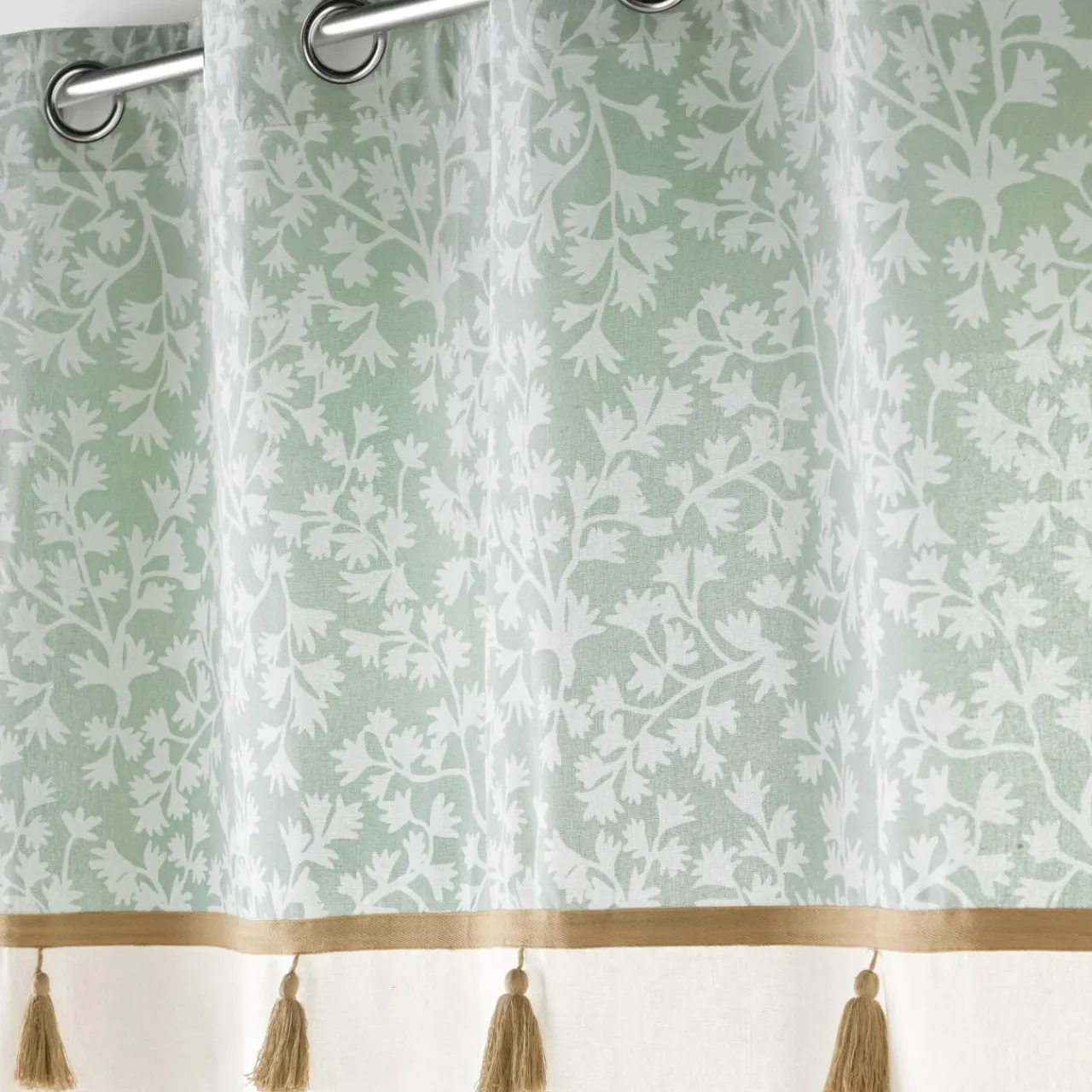 Imprimé : rideau à motif fleuri et pompons en jute.
