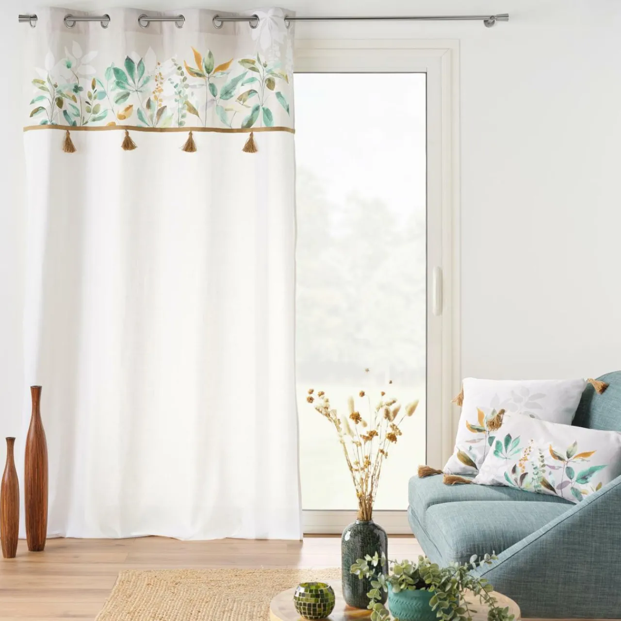 Matière : bas du rideau : 54 % coton et 46 % polyester. Haut : 100 % coton. Pompons en jute.