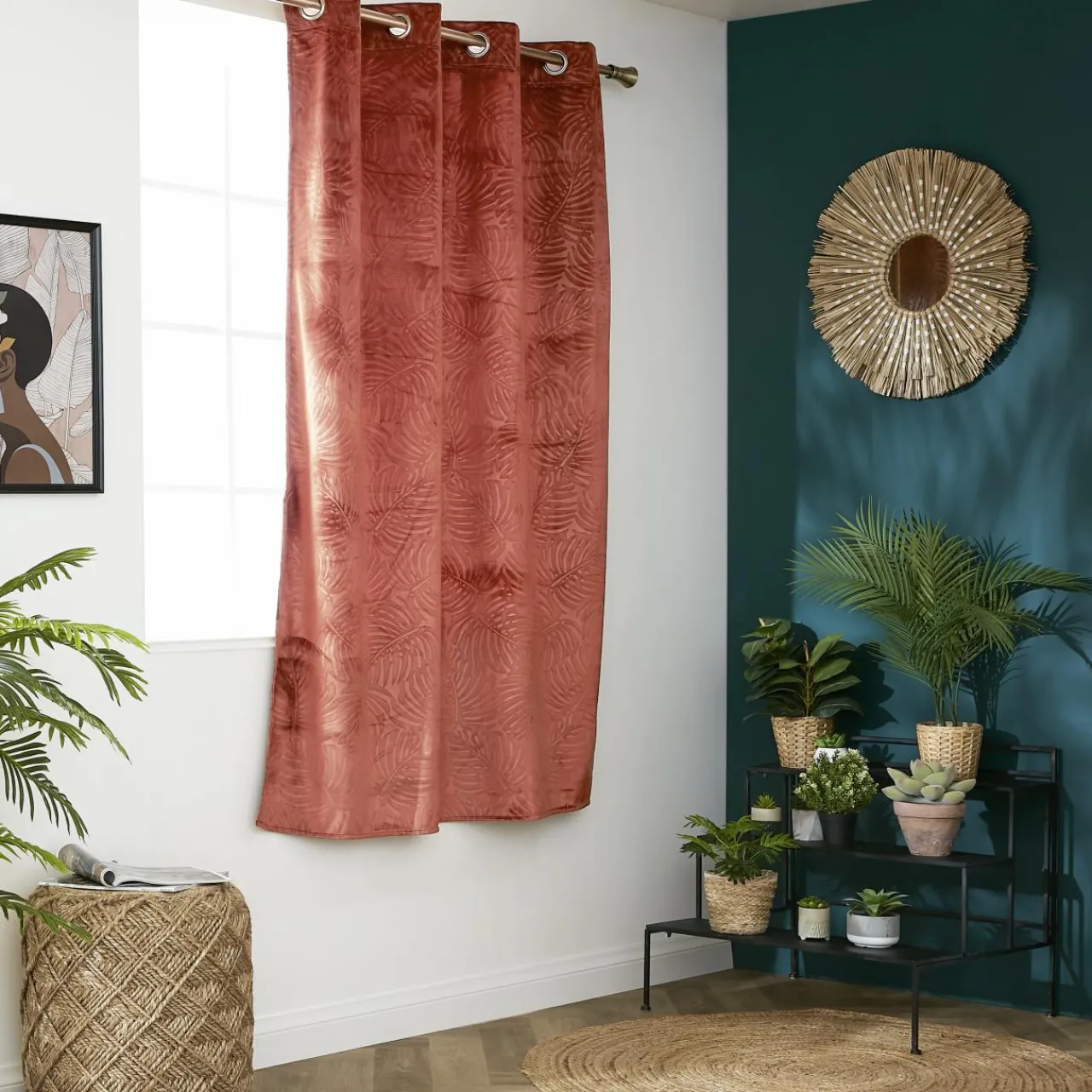 Imprimé : rideau à motif feuillage en relief.