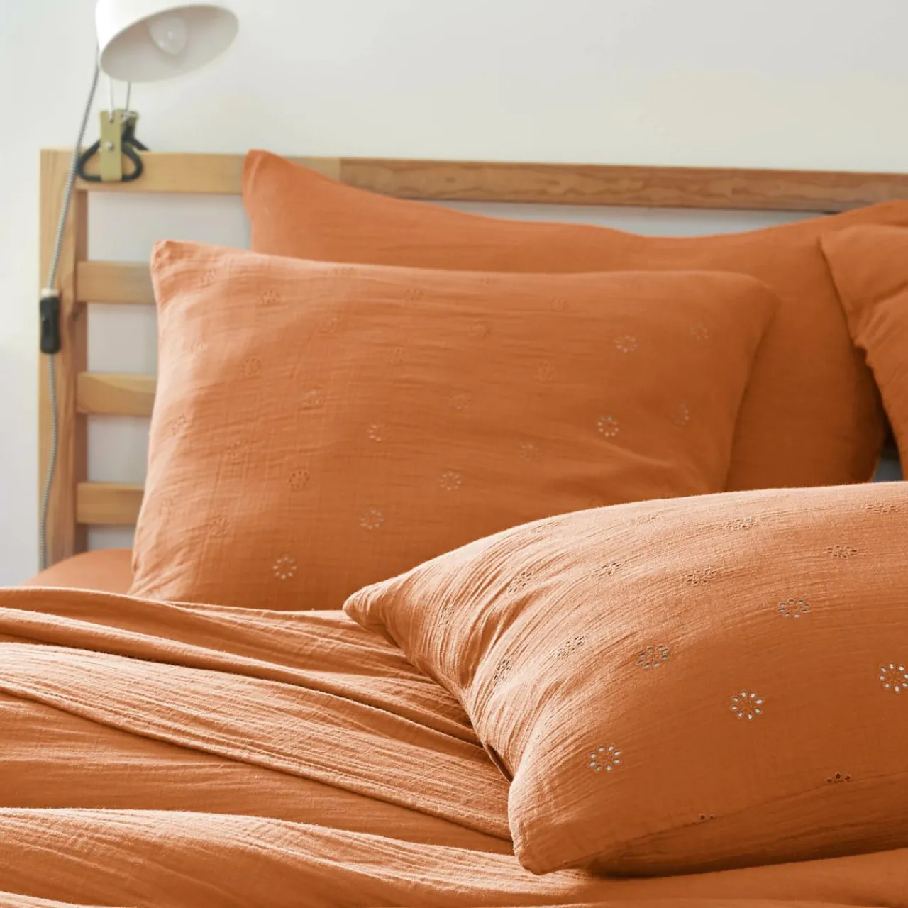 Imprimé : taie fleurie style broderie anglaise.