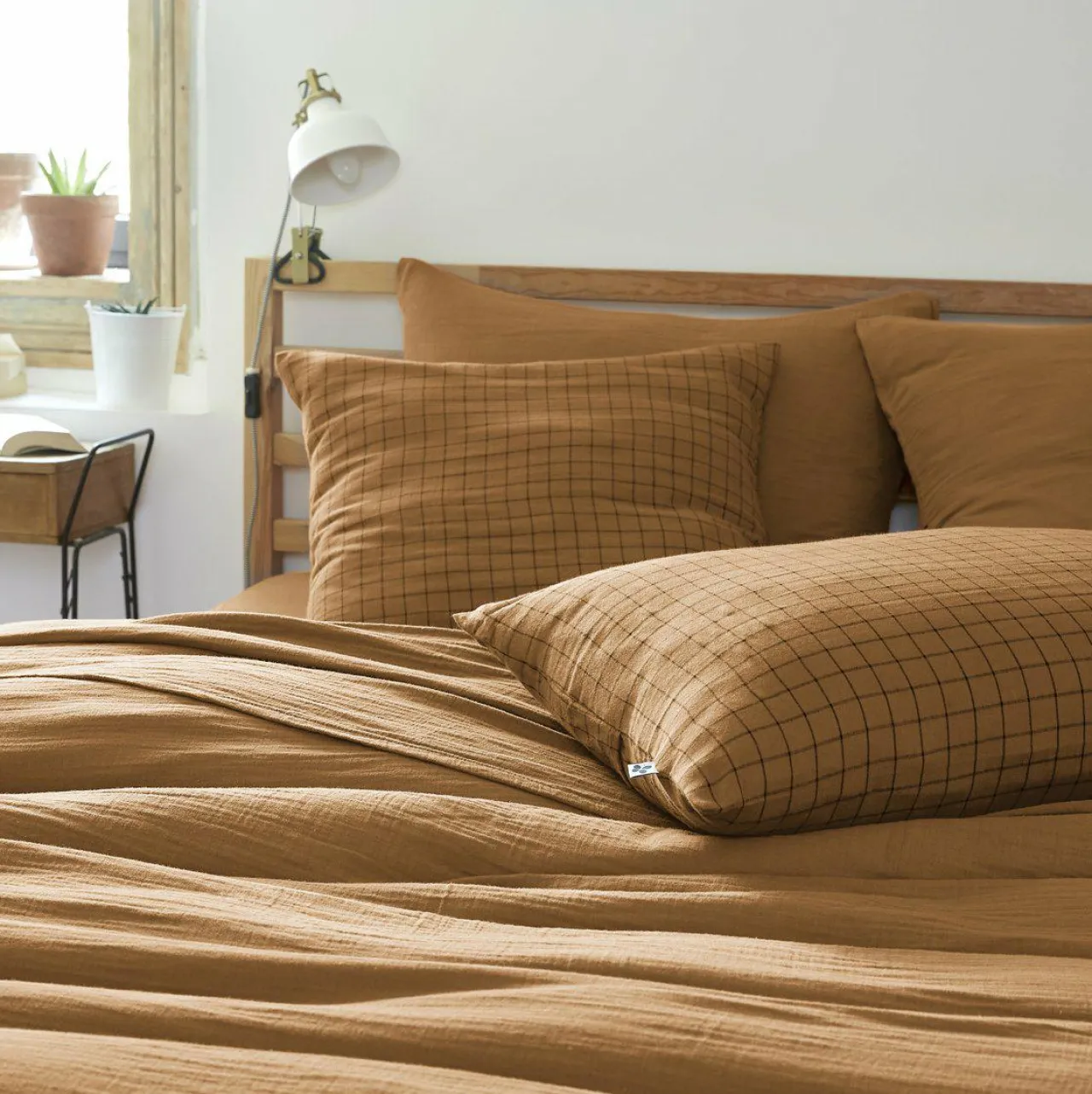 Imprimé : taie à petits carreaux.