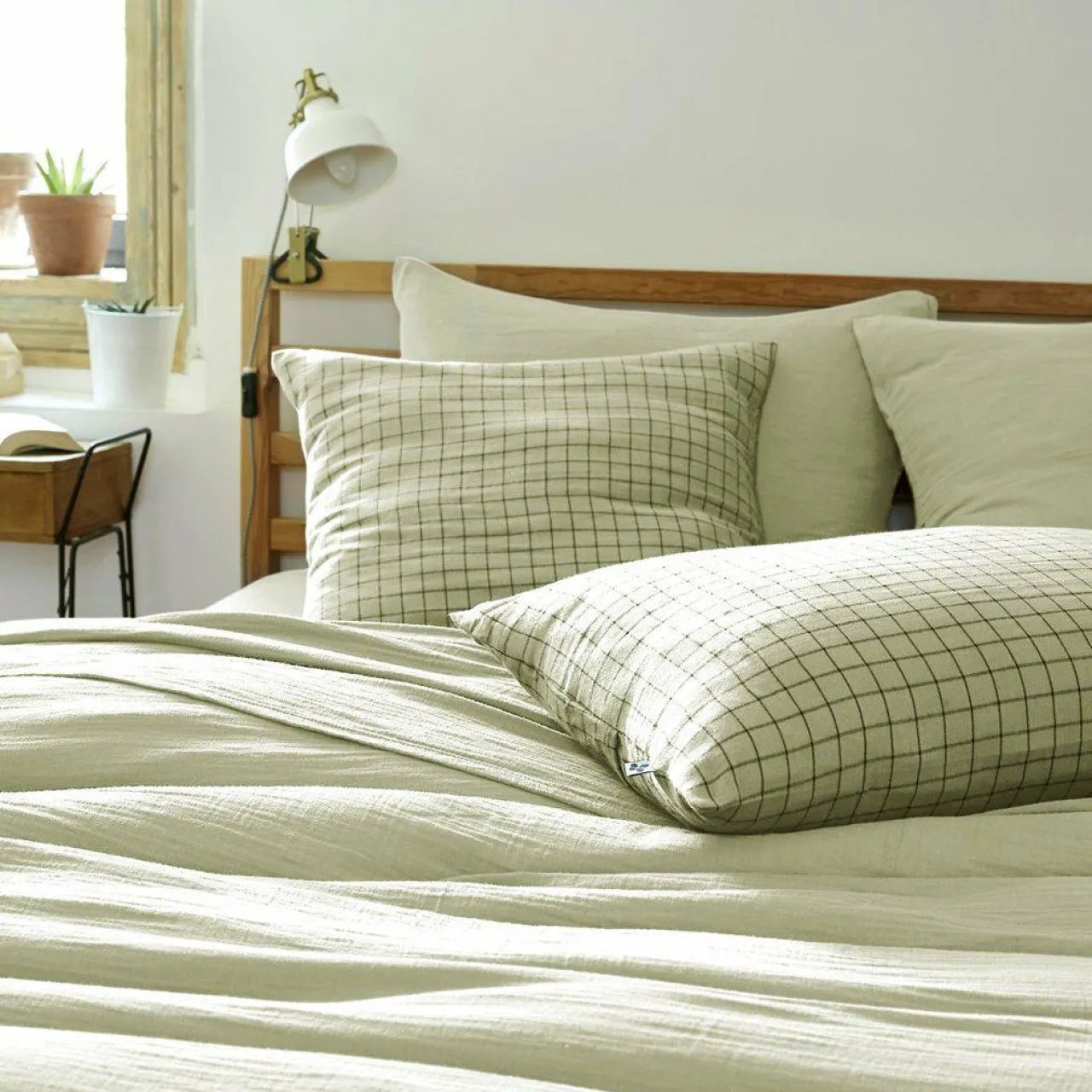 Imprimé : taie à petits carreaux.