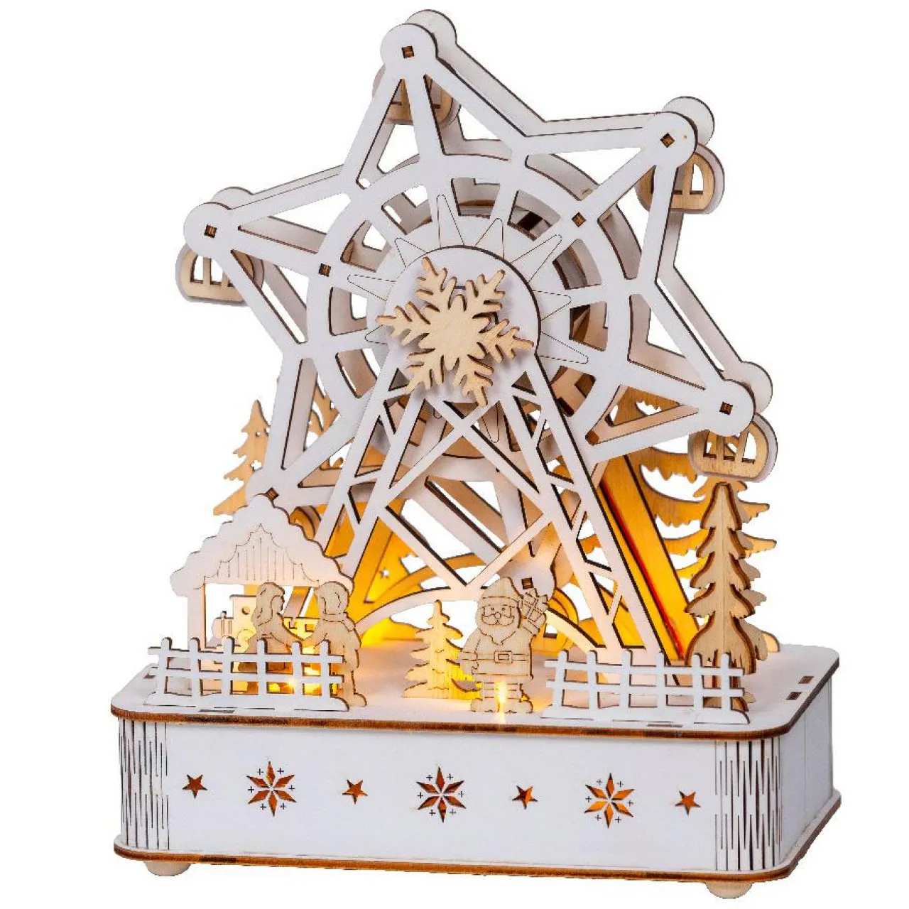 Ce charmant village de Noël en bois lumineux et musical est une véritable invitation à la féérie des fêtes. Avec sa grande roue animée, il crée une ambiance chaleureuse et festive. Fonctionnant à piles, il peut être placé où vous le souhaitez pour égayer votre intérieur.